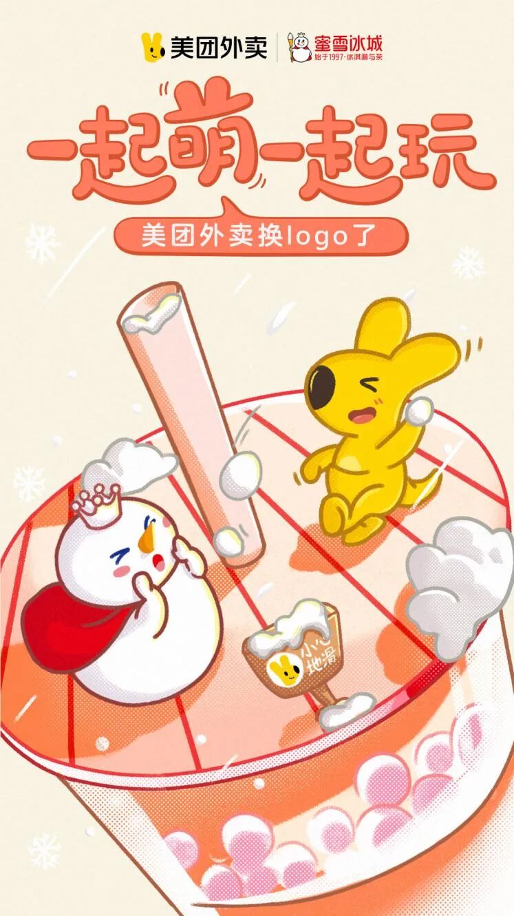 继续陪在你身边短片以外卖员的第三人称视角去看待众生相:有想共同攒个家的情侣,有为孩子生活奔走的父亲,有经历过创业苦的夫妻,也有用一日三餐传情的异地恋,以及因为疫情原因无法开业的小店。美团外卖想通过记录每一个生活新故事去诠释无论是什么模样,它都将继续陪伴在你身旁。可以理解为这是大袋鼠的一封告别信,也是新logo给广大用户的一封漫长的情书。这封情书还寄给了美团外卖的合作伙伴,在蓝V端,美团新袋鼠和一众拥有可爱IP的品牌互动上了,真的是吉祥物至萌则无敌啊,怪不得网友说想rua他们!话说,QQ企鹅肥了,天猫肥了,京东狗也肥了,现在就连美团袋鼠也变胖了,眼看这动物变萌后纷纷成为品牌的吉祥物,大自然表示供不应求哇。其实在《卡通形象营销学》一书中有提到:“卡通形象能够影响消费者行为,带有动物卡通形象的零食,与没有动物卡通的相比,消费者购买前者的意愿会增加25%左右。”怪不得品牌们都喜欢用动物。但这用猫猫狗狗就算了,还有河马、蚂蚁、鱼、燕子....天猫还索性直接开了个动物园。还有那卖坚果的三只松鼠不仅吉祥物是松鼠,连品牌名都是。就连美团外卖的“对家”饿了么,也变身萌萌的暖男,推出动画公益短片《这一路,无退路》,以二次元的方式展现了外卖小哥送餐过程的不易。还有这次和美团外卖联动的一只丑萌丑萌的小黑鸭「嘿嘿」也是周黑鸭家的吉祥物。不要说互联网企业了,如今共青团中央、人民日报、新华社等党政媒体都在都在主动适应二次元语气,并积极向年轻人群靠拢。此外,关于“新中国刚成立”、“钱学森报效祖国”、“银河号事件”等相关历史也是由萌萌的中国兔演绎,相信不少人应该都看过《那年那兔那些事》系列。