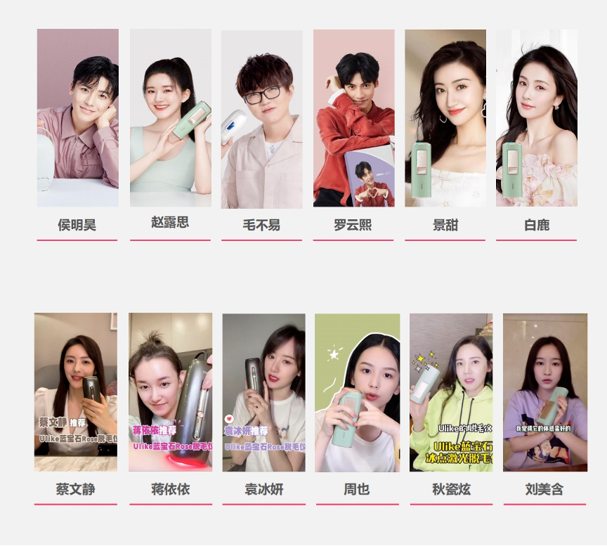 Ulike邀请全智贤为品牌代言人,同时与毛不易、罗云熙等明星进行合作,通过社交媒体平台进行产品的推广。