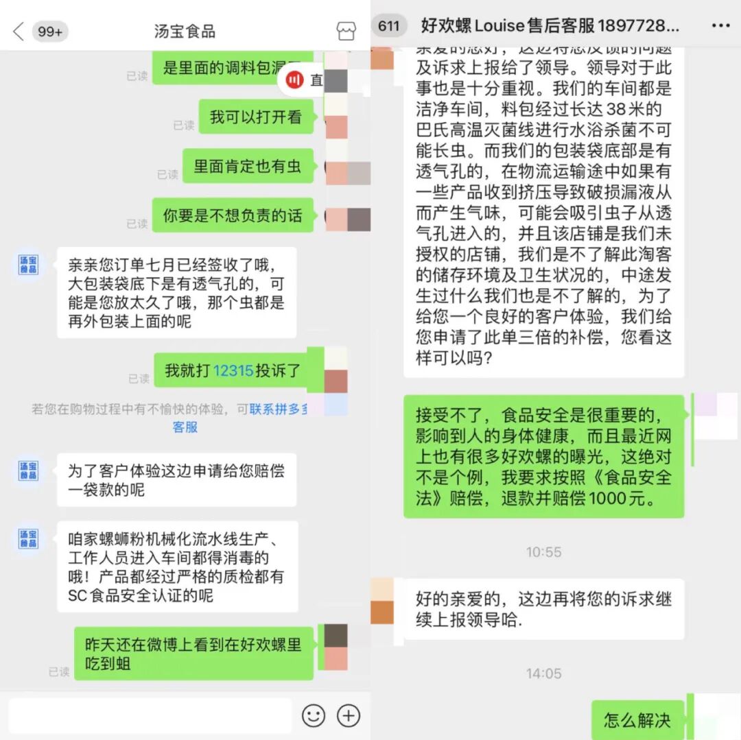 张怀向连线Insight指出,她是在一家名为“汤宝食品”的店铺购买的好欢螺,店铺表示:“七月份显示签收,可能由于存放时间过长导致有虫子”,并欲赔付一袋螺蛳粉的价钱。随后,张怀联系到好欢螺品牌客服,对方称可以按其下单价格三倍进行赔偿,但对于张怀提出的按《食品安全法》赔付一千元的要求,客服表示正在与领导沟通中。