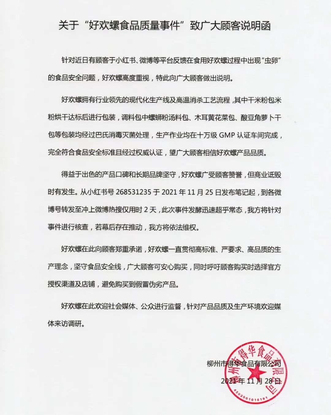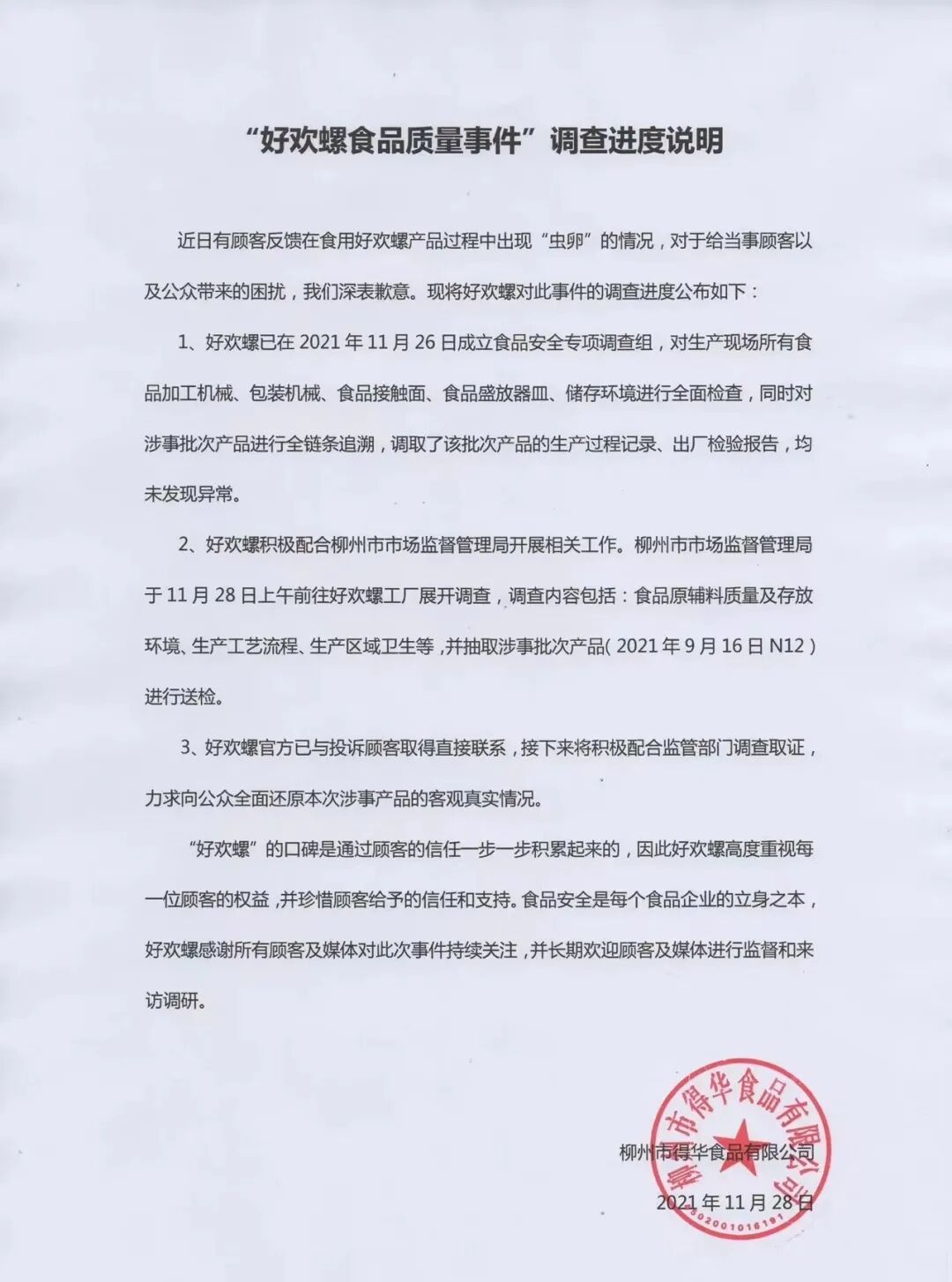 面对质疑,好欢螺在当晚发表了关于“好欢螺食品质量事件”调查进度说明。声明中表示,对当事顾客及公众带来的困扰表示歉意,并已在11月26日成立食品安全专项调查组,对涉事批次产品进行全链条追溯,调取了该批次产品的生产过程记录、出厂检验报告,均未发现异常。与此同时,好欢螺还在接受柳州市市场监督管理局的相关调查。