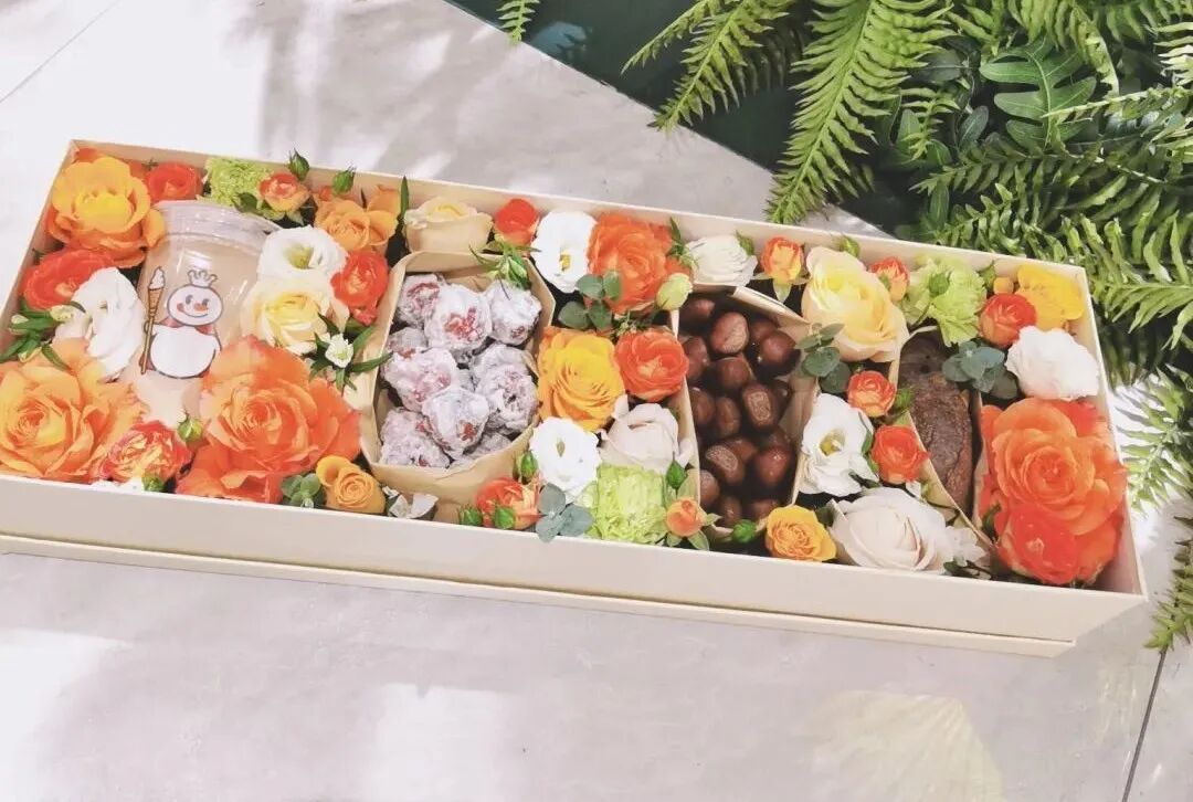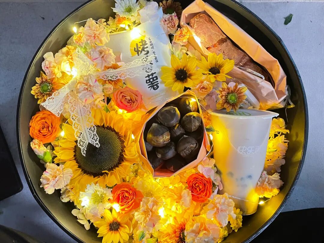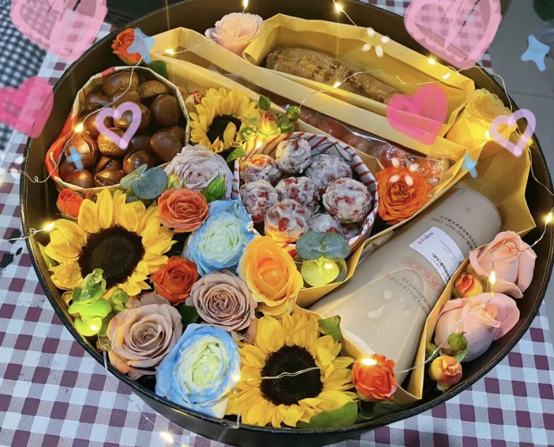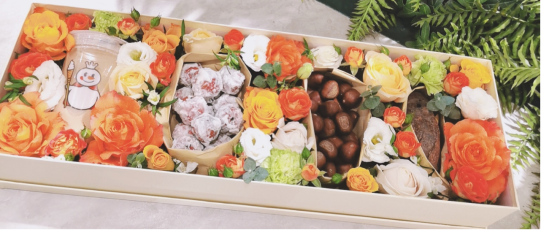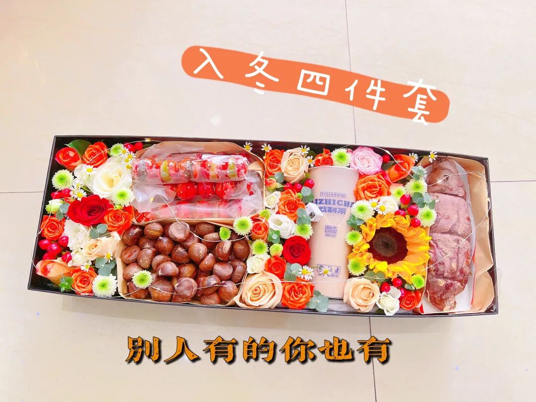 奶茶+鲜花+糖炒栗子+烤红薯,包装成一份精美的礼物,被称为“入冬第一份礼物”、“情侣冬季必备”。