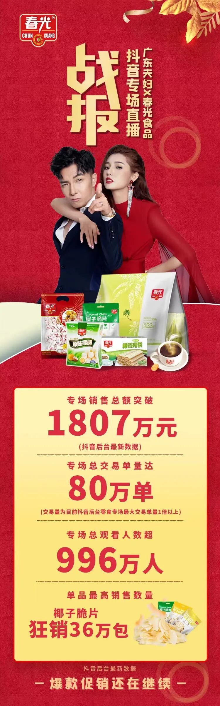 除此之外,海南省文昌市政府领导还空降直播间,带来领导专属优惠,与达人共同带货。一场直播,城市共振,打造了春光食品品牌超级公信力的同时,也助力海南城市文化的出圈。