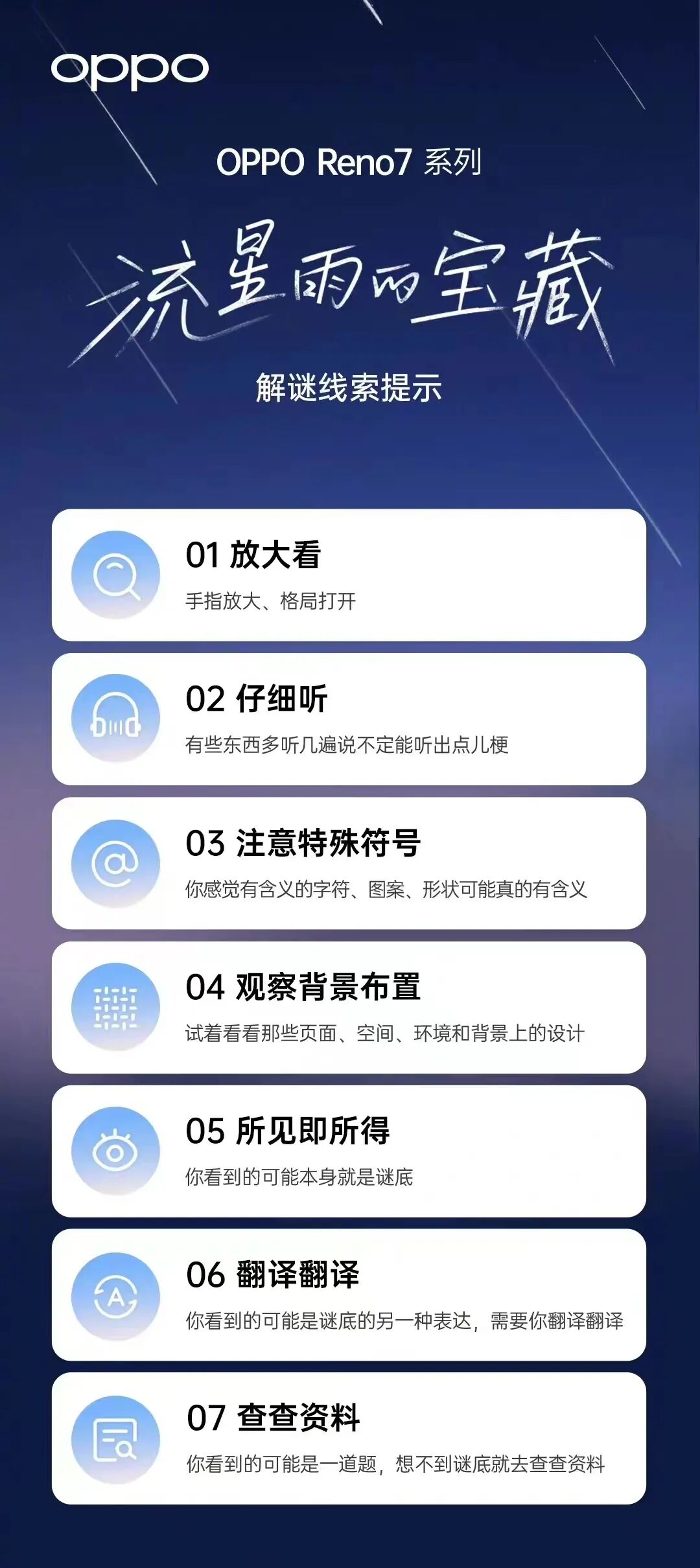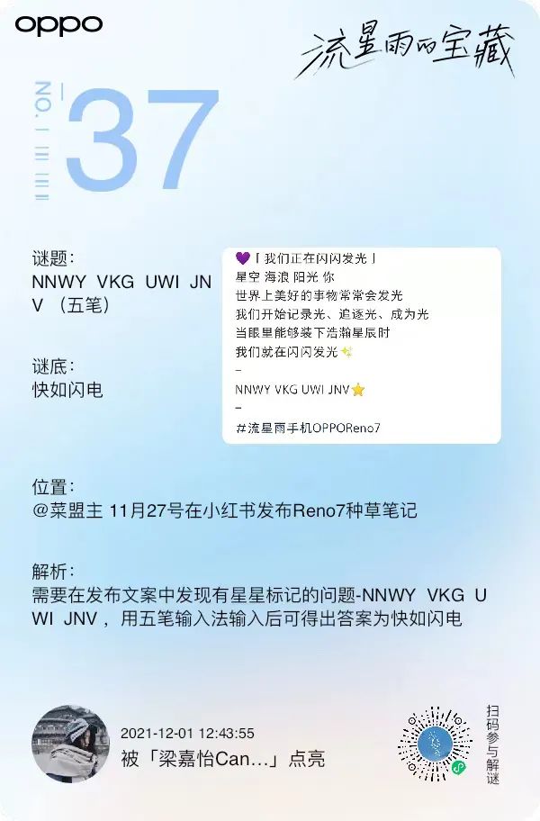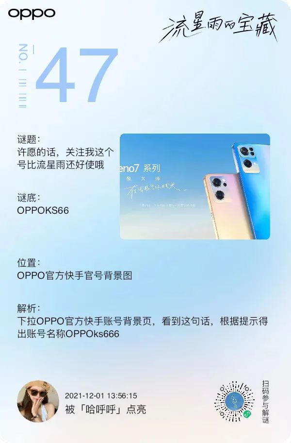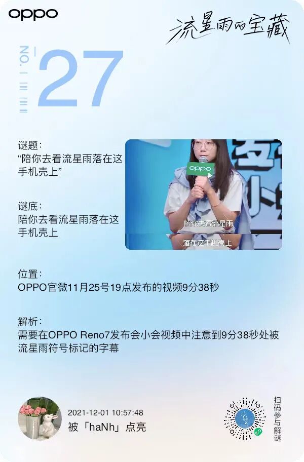 最近,OPPO又出奇招了,基于Reno7「流星雨背板」外观,打造主题为「流星雨的宝藏」活动,还制作了悬疑短片,宣布创意物料藏了77个宝藏谜题,引发大批网友寻宝,玩得不亦乐乎。01