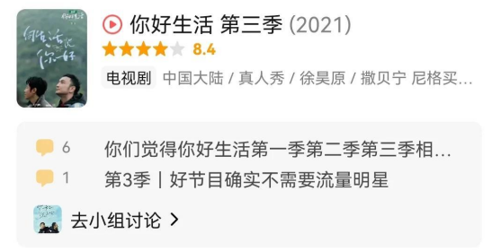 除了在微博,《你好生活》在豆瓣、B站等平台也榜上有名,在豆瓣综艺排名第三,B站综艺榜排名第一、全平台热搜223次,成为现象级爆款。央视头部媒体、主流娱乐媒体和各类视频博主纷纷对《你好生活》进行推荐,实现了口碑热度双丰收。