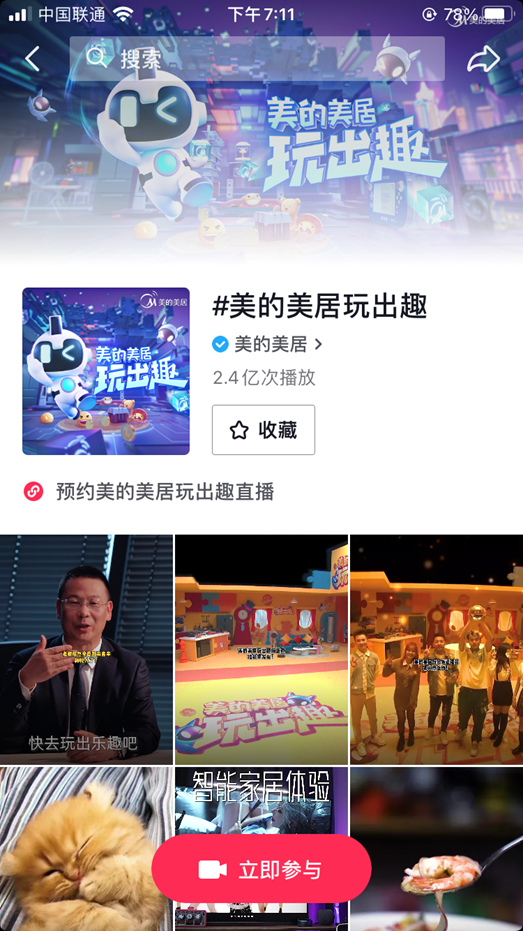 美的美居鼓励那些热爱生活喜欢创作的年轻人记录生活中充满仪式感的瞬间。无论是戏精的观影仪式还是精致的睡前仪式,都可以拍成视频上传在抖音#美的美居玩出趣#挑战赛,这一波操作得到了抖音年轻用户积极响应,数据显示,在11月18日至12月5日,共2.4万人参与挑战,所有参赛视频播放量总计达2.4亿。