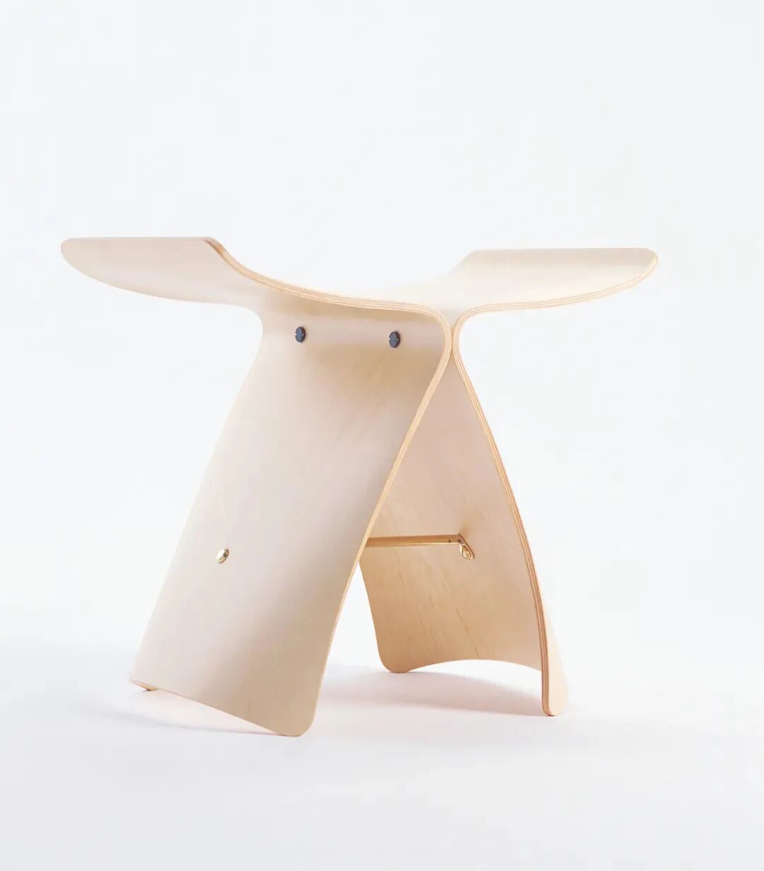 “高频技术成型的合板,由两颗螺钉和一根撑条组合而成。单纯明快的构造当中,活用具有日本特色的曲线,诞生出柔和的造型美。正是出于这种造型美,直至今日也被人们喜爱,持续销售至今。”