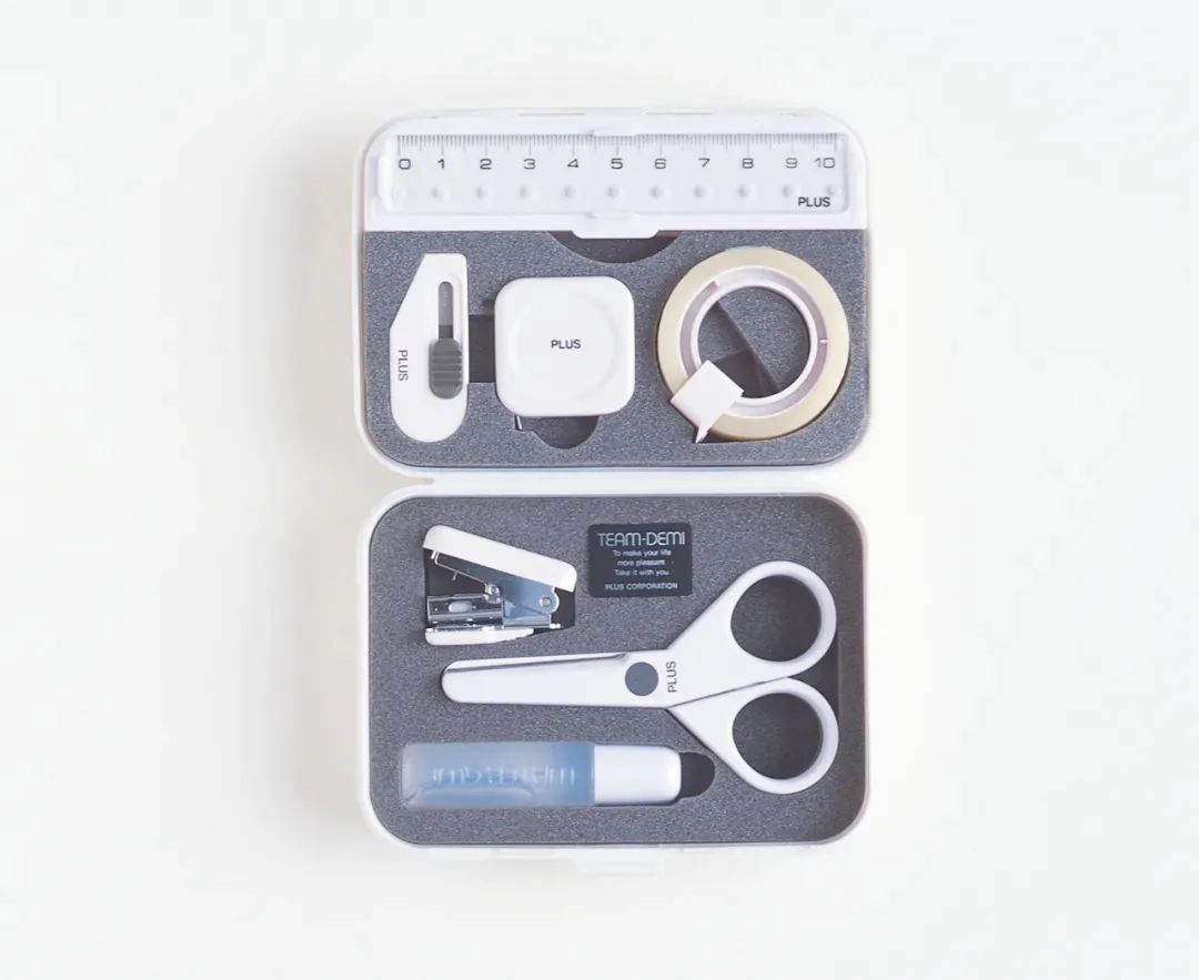 “可在小盒中收入7小件不同的文具组合是这套文具的主要功能。文具类别按照剪切、粘贴、装订等不同作用的物品使用频率来决定。设计师不光考虑到每种文具,还对作为组合使用的乐趣也有所考量。”