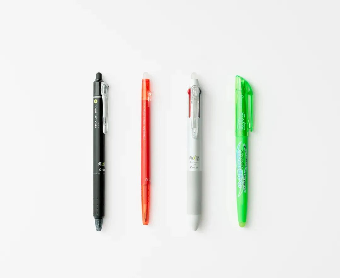 “摩擦就会消失”的笔记文具,FRIXION系列。使用了遇热会变成无色的独自开发的墨水,热擦除性的笔记文具。用本体附属的专用橡胶摩擦产生的摩擦热,墨水的颜色会变得透明。采用以前没有的擦除方法,不会出现擦除痕迹,可以多次书写、擦除。