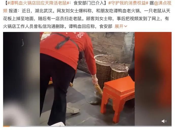 近日,武汉一家谭鸭血老火锅门店因“老鼠从天花板掉落砸到食客”事件上了热搜。两天后,谭鸭血发布致歉声明,称涉事门店当时正在进行鼠害消杀处理。