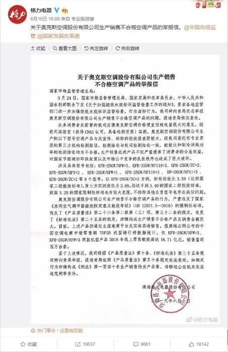 2019年6月格力在微博上发布了《关于奥克斯空调股份有限公司生产销售不合格空调产品的举报信》,声称奥克斯的空调许多存在着不达标的问题。