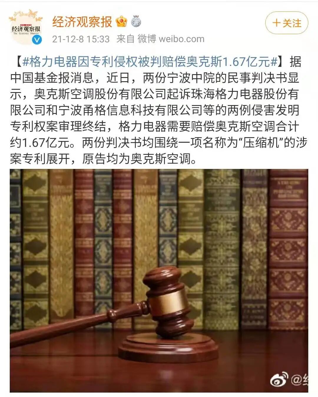 昨天划水工作的时候,无意中看到一条热搜#格力因专利侵权被判赔偿奥克斯1.6亿#!