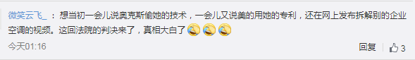 还有网友揶揄道:“想当初一会儿说奥克斯偷她的技术,一会儿又说美的用她的专利,还在网上发布拆解别的企业空调的视频。这回法院的判决来了,真相大白了。”