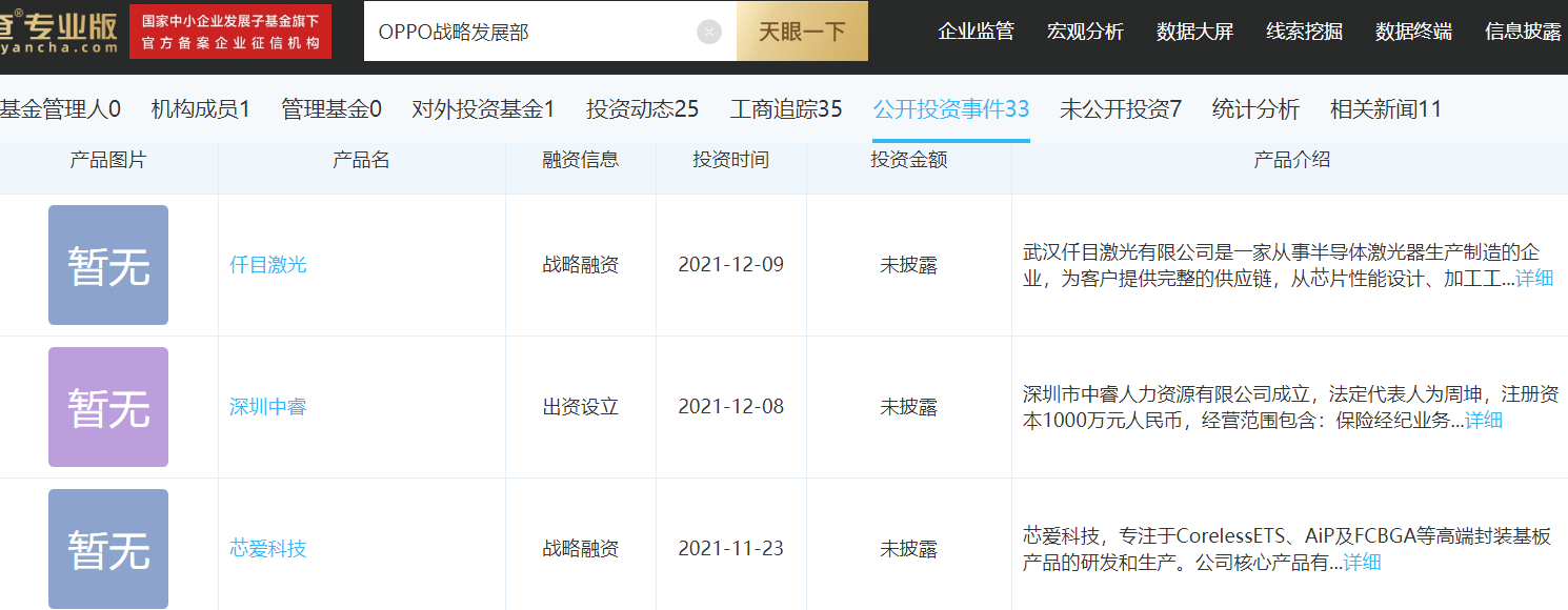 吃够了“高价低配”、“厂妹机”的亏之后,OPPO显然也希望能够做出改变,开始向着科技方向发力,研发技术专利。据天眼查专业版APP显示,OPPO战略发展部投资了不少科技企业,但却陷入了科技陷阱之中。