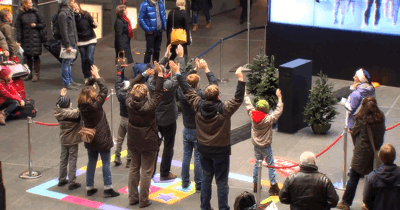 游客站在指定的范围内摆动双臂、跳跃或左右挪动身体,都会被程序捕捉,反馈给AR系统,接着圣诞老人和可爱的雪人就会出现在屏幕上,等待着和游客一起堆雪人、滑雪橇。