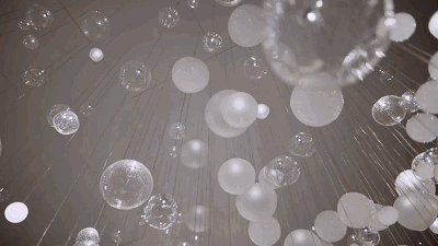 这是款会呼吸的灯,参与者可以像小时候玩吹气泡游戏一样,对着灯具轻轻吹气,灯光便会依次亮起,在呼吸之间,上千颗水晶灯便点亮了整个空间,让人仿佛置身于梦境之中。