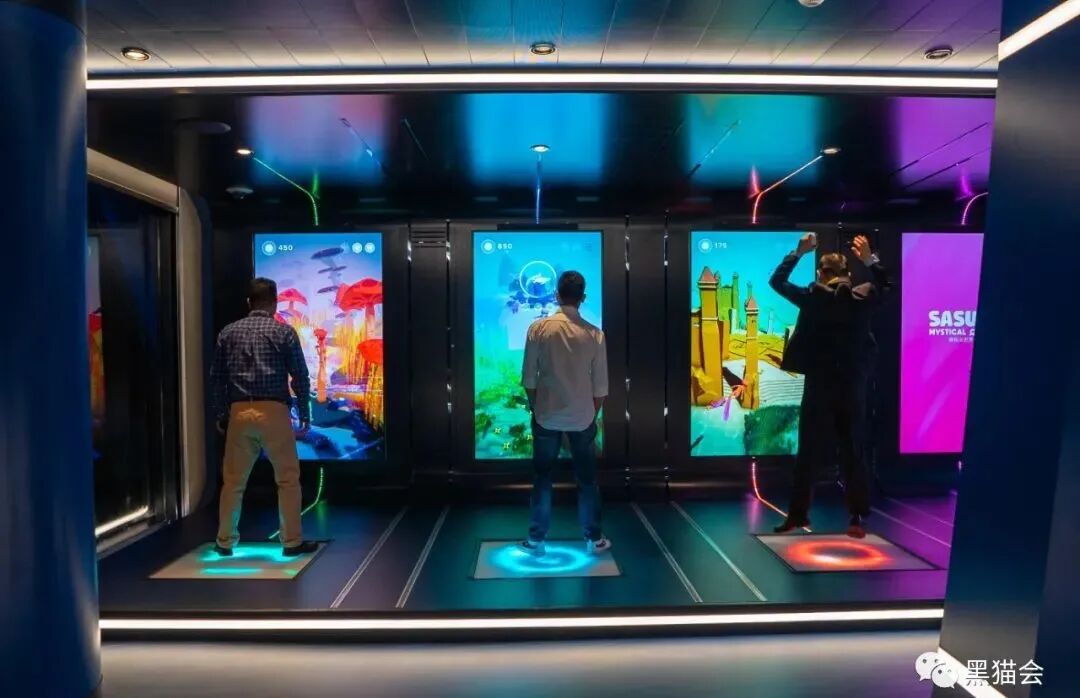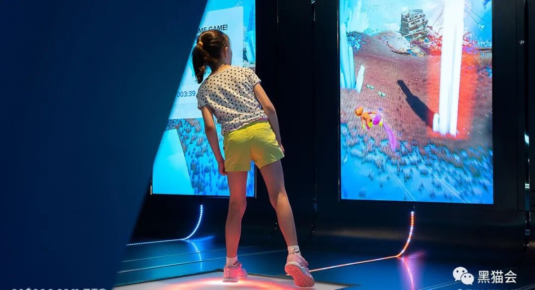 装置的玩法是帮助游戏主角在四个海底世界中航行,脚底下是定制的 LED平衡板,通过网格地板上的脚步跟踪系统去配合游戏玩法,利用左右摇晃身体、跳跃来控制游戏角色,一场“沉浸”在海底世界的神秘之门就此打开。