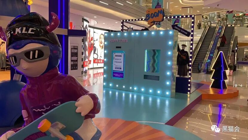 整个商场被巨大的“圣诞树”灯饰点缀着,穿着五彩缤纷的“毛衣”,悬挂在上空。