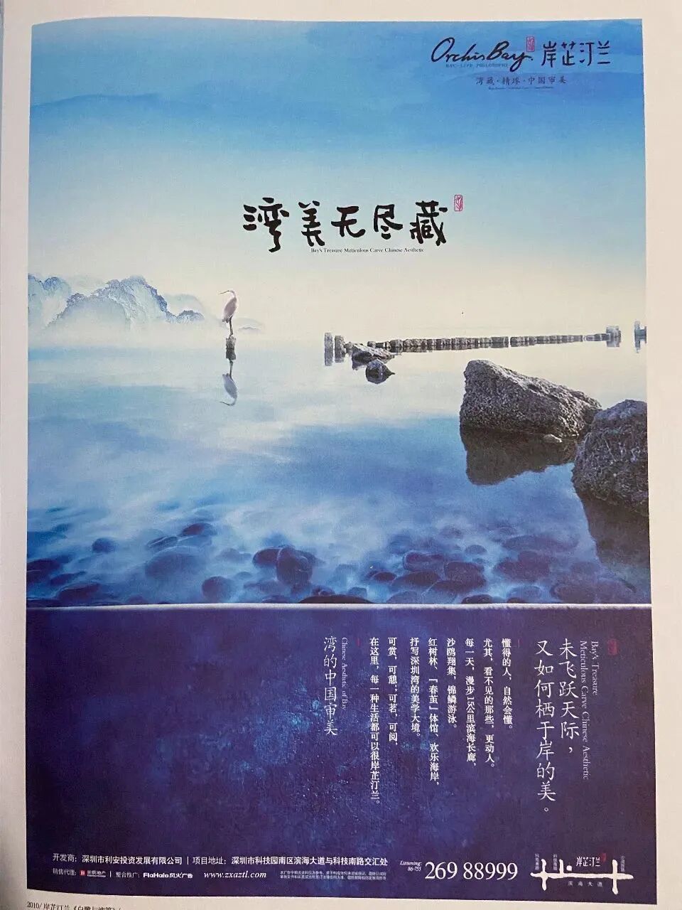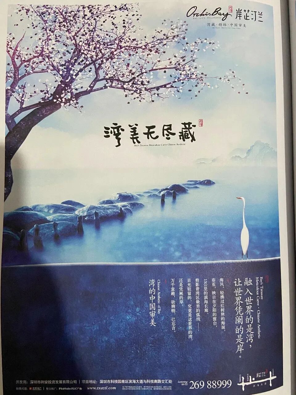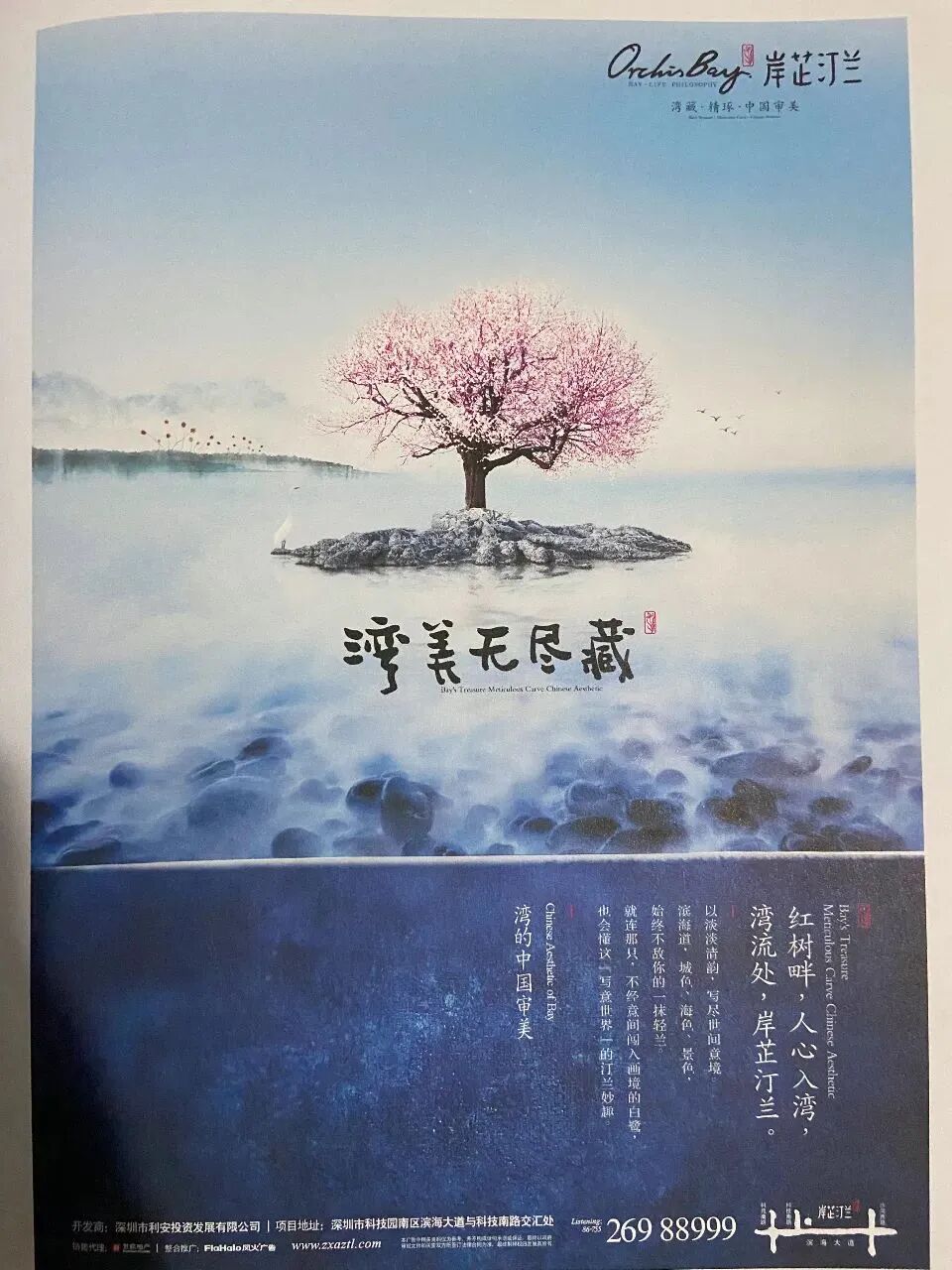 “岸芷汀兰”出自北宋范仲淹《岳阳楼记》,指岸边的香草和小洲上的兰花。绝美的文案搭配写意的水墨画面,好一个“湾美无尽藏”。