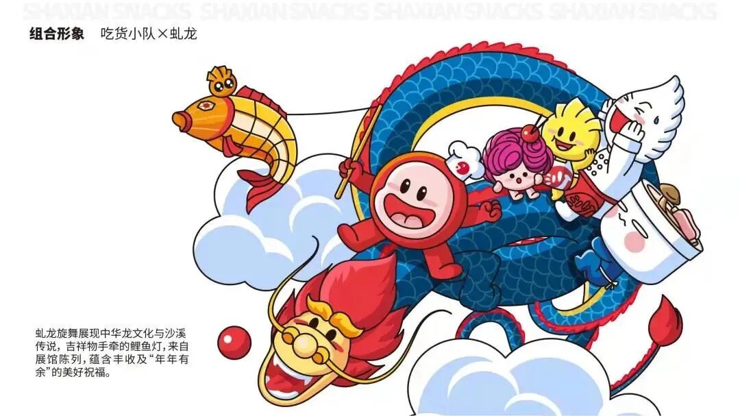 沙县家族的朋友,形象来源传统龙文化与沙溪传说,饱含着一种美好祝福。虬龙为沙县的IP形象增加了文化底蕴色彩,升华了设计的立意,这个人物的诞生有点出乎意料。在沙县之光系列里,有兄弟、爱侣、朋友组合,充满了生活的气息,一如既往的接地气。透过这5个生动的虚拟人物,我们的脑海能联想起真实的生活场景,就像在讲述一个友邻家长里短的故事,亲和又有趣。每个人物都能精准传达沙县菜品的特色之处,指代清晰而明确,无形中提高了产品的辨识度,加深印象记忆点,有助于拉近和顾客的距离。