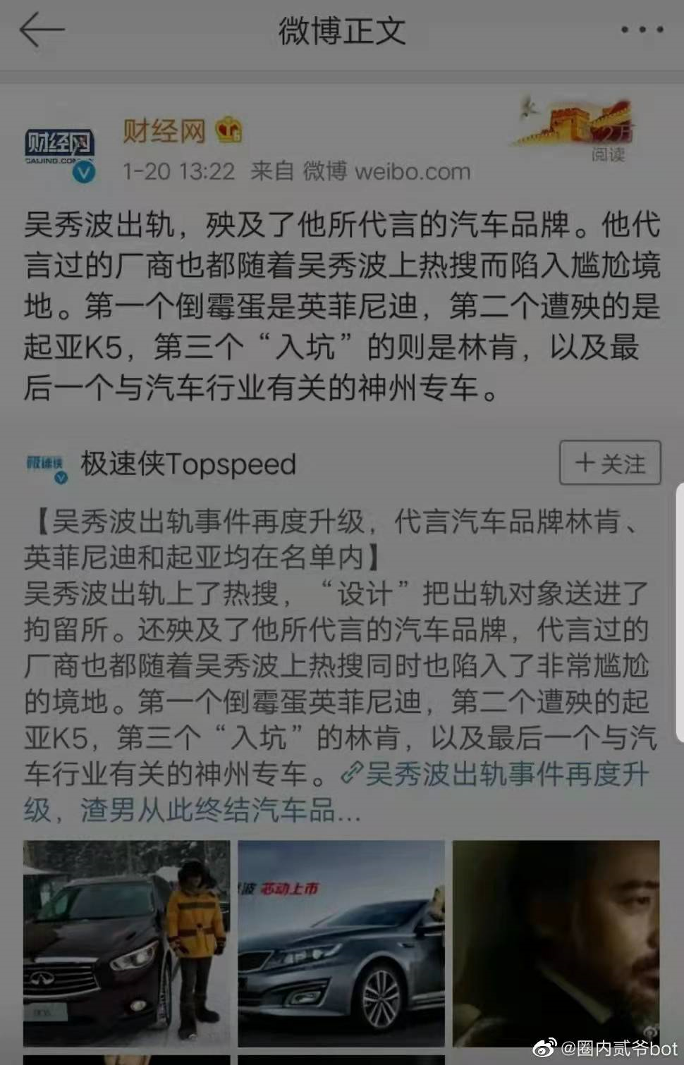 英菲尼迪解约流程如此熟练也不是没有道理,因为它之前的代言人有吴秀波、高晓松。emmmmmmm,希望英菲尼迪下一次找代言人擦亮双眼吧。