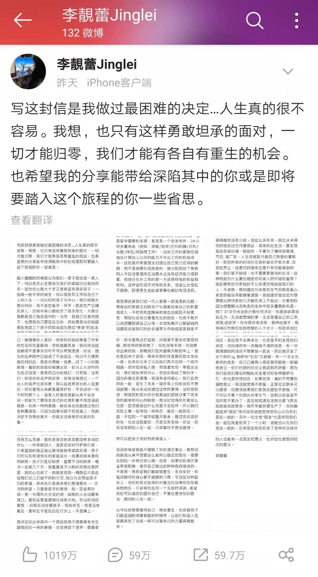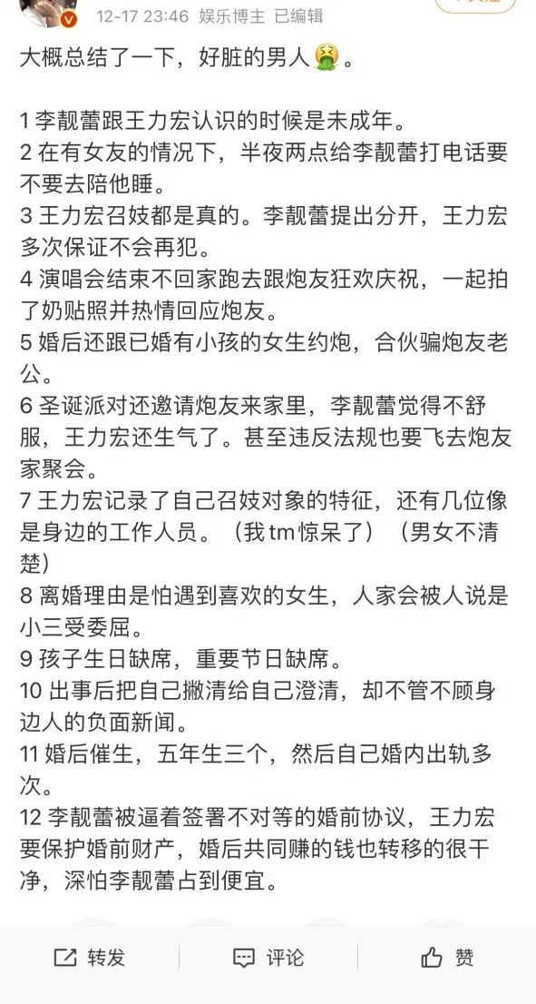在2021这个偶像塌房元年,粉丝们永远不知道下一个翻车的是不是自家爱豆。昨天晚上刚过11点,王力宏的前妻李靓蕾在微博发文,给王力宏写了一万多字的长信,言辞犀利,字字珠玑。李靓蕾不仅控诉婚后王力宏一直对自己催生、冷暴力,还用简体字、繁体字、“他”、“她”等符号,把王力宏约炮、招妓等传闻一一锤了个遍。