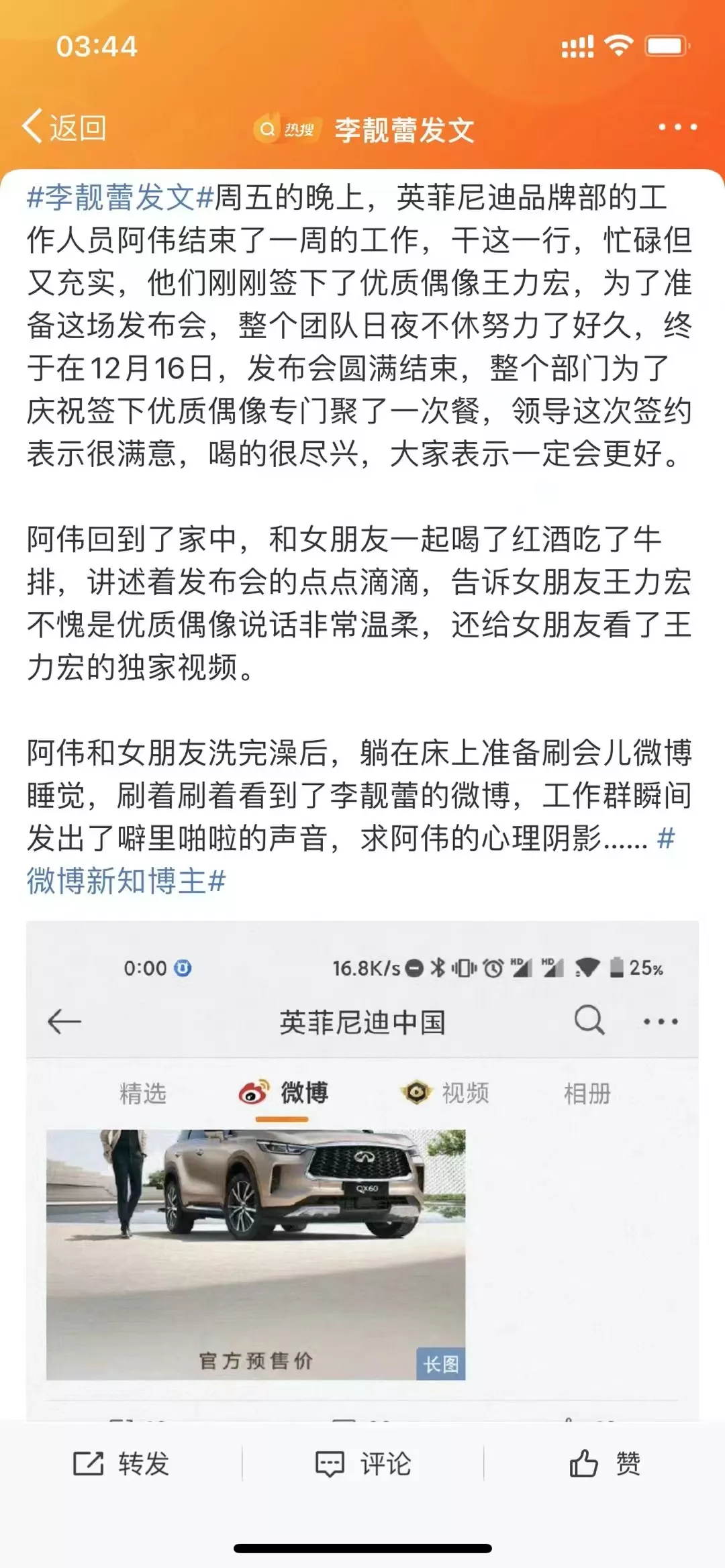 话题度最高的还是豪车品牌英菲尼迪。刚官宣代言人就翻车,英菲尼迪实在是惨惨惨。12月14日,英菲尼迪预热王力宏为代言人。现在看当时的文案,才华横溢、气质出众,要多讽刺有多讽刺。12月16日晚,王力宏还亮相了英菲尼迪的新车发布会,并演唱了《唯一》。王力宏的唯一,其实就是他自己吧?从官宣代言人到发布解约声明,整个算下来,王力宏的英菲尼迪代言人只当了35个小时。“王宇直”自此又有了一个新的绰号:“日抛型” 代言人。当然,英菲尼迪由于危机公关反应迅速,“加班解约”的效率还是收获了不少好评。