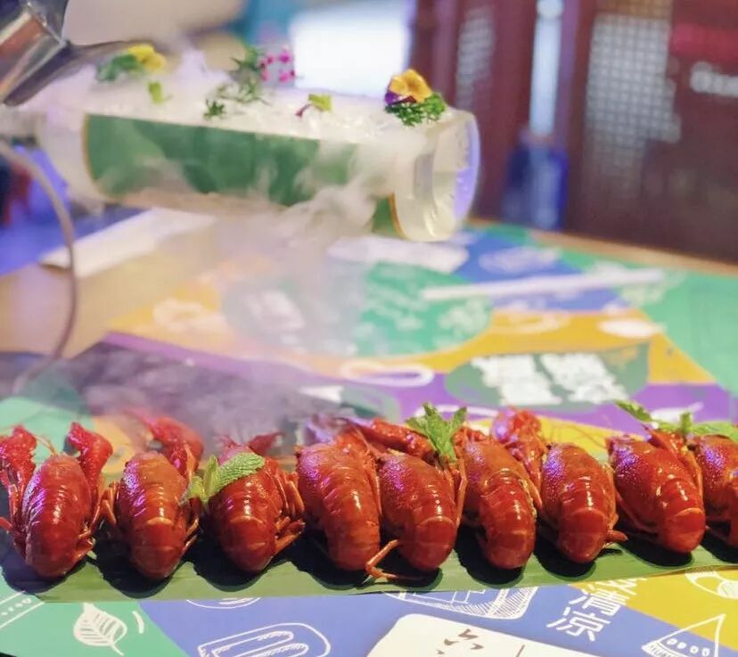 除了鸡尾酒以外,六神花露水甚至还联合沪上知名龙虾店,推出了一款六神花露水味的小龙虾,小龙虾点缀以薄荷,再摆上经典的六神花露水,画风有点醉……