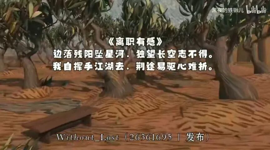 B站网友@蒋sir阿,曾经历过一段刻骨铭心的单相思。他暗恋的女生名字里有月亮的谐音,于是他就写下了一首《失眠》,隔空向女生表白。每一个夜晚的月亮都不同,而你是唯一。与“晓看天色暮看云,行也思君,坐也思君”有异曲同工之妙,单相思的苦楚戳中了不少人。看到最后才发现前面的妻子是意向,把单身说得那么清新脱俗。——Without_Lost(26361695|发布)借景抒情,有点刘禹锡的味道,“独望长空志不得”,和古人贬谪后那种怀才不遇的心情如出一辙。“荆途易驱心难折”又写出了人那种不甘于现状,不屈服的心境,这种处境让不少职场社畜深有同感,难怪弹幕有人说“大家的离职素材又丰富了”“离职申请就写这个了”。