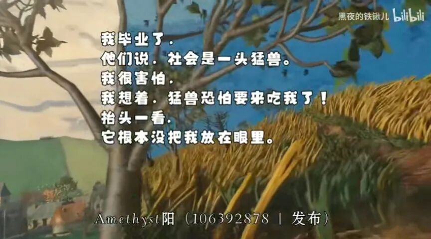 ——不能被褒义词形容的人(414072355|发布)通过借代的手法,高度讽刺当今社会流言蜚语对人的伤害,“流言颠簸”“嚼烂一生”形容很巧妙,流言就像嘴里的瓜子,嚼烂的是别人的一生。——Amethyst阳(106392878|发布)这首写出了作者在社会中没人关心的孤独情感,以为毕业后的生活是猛兽,实际发现猛兽对我们根本不屑,毕业生好难。背景图片是梵高的绝笔之作《麦田上的群鸦》,在这幅画的衬托之下,显得更加无力、仓皇。