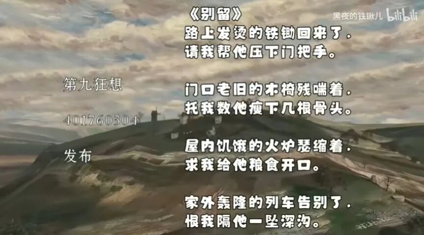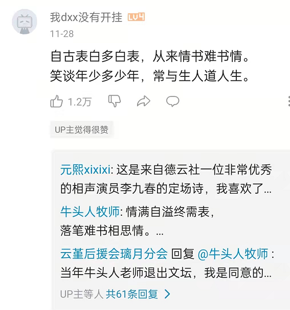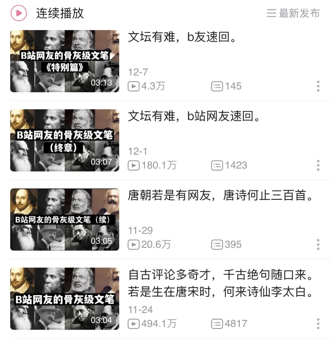 还记得之前戴建业老师、UP主@有山先生 发起的#写诗鬼才#的活动吗,这个活动不仅让戴老师火了一把,也让B站兴起了一股新潮流:跟戴老师一起学「写诗」。在B站写诗有多火呢?众多网友激情创作,#写诗鬼才#话题下至今已有数万条讨论,还一度登上了微博热搜榜。最近,B站UP主@黑夜的铁锹儿 的一条网友写诗的视频又火了,他精选了一些网友写的诗,做成精华评论合集视频,并将其命名为“骨灰级文笔”,没想到这条视频很快冲上B站热门,目前为止播放量突破490w。因为反响热烈,UP主还将视频评论区和网友的私信投稿整理出来,发了四期评论合集。打开视频更是满屏的弹幕,网友高度称赞为:“中华文化复兴!”“新时代即兴主义文学”,更有人评论“老师们当初解散文坛的时候我是反对的”。