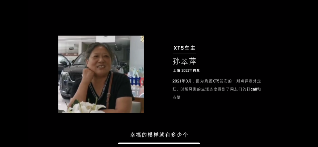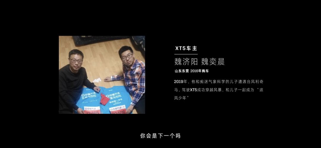 追风中故事的男主角为魏济阳,是2016年购车的XT5车主,大片的故事就是真实发生的事,2019年,他和痴迷气象科学的儿子遭遇台风利奇马,然后驾驶XT5成功穿越风暴,和儿子一起成为“追风少年”。收获中男主角李冉,2019年购车车主,每周驾驶XT5往返家里到村里上百公里的路程,但却因为找到幸福的模样,完成了原定项目下依然留下。冠军篇中的王惠惠,是一名凯迪拉克销售冠军,XT5的陪伴让她对生活充满热情;点赞中的孙翠萍则是因为一则点评意外走红,强化了一种很潮的开车态度。这些都是真实发生的#我和我的XT5#故事,真实的用户故事,相对于明星来讲更让用户代入感,拉近凯迪拉克与用户的距离,激发用户的情感共鸣。而且通过接地气的用户故事,向用户输送品牌温度和传递品牌精神,也更容易让用户接受。