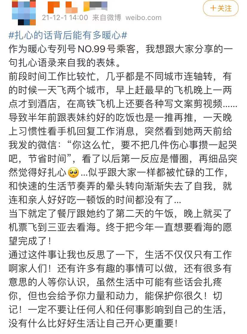 此外,科兴与人民日报还在微博同步了#扎心的话背后能有多暖#话题,引导用户参与分享,借由用户自身的故事感动了更多的用户,从而扩大了营销半径。