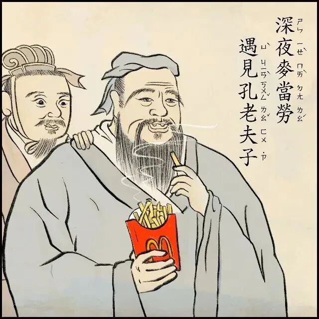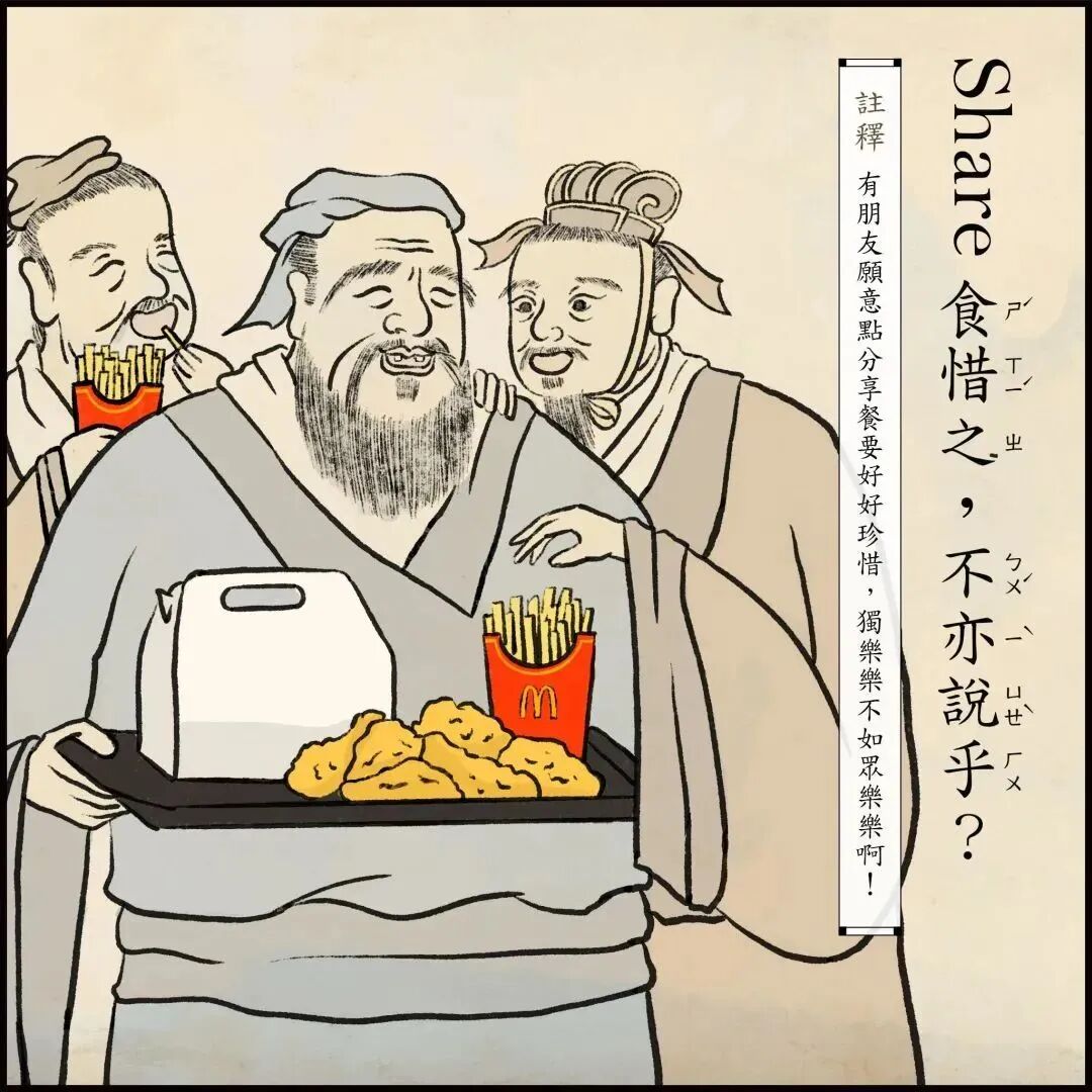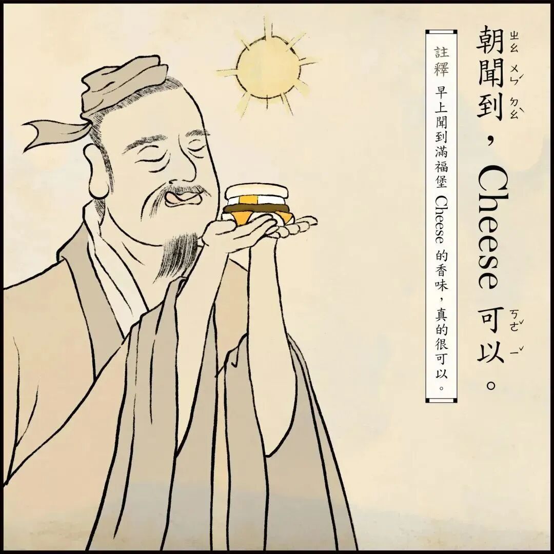 岁末年终,各种各样的盘点、评比层出不穷。广告领域也不例外,由中国台湾《动脑》杂志举办的第二十八届“广告流行语金句奖”的评选结果也发布了。需要注意的是,这个奖项的评选仅限于中国台湾地区啦。今年的“年度十大金句”和“年度十大社群文案”评选结果究竟如何,让我们先看再说。这是麦当劳在教师节推出的一则广告,通过英文对与同音中文的替换,来完成了对于《论语》经典名篇的解构和再创作。在广告中,“朝闻道夕死可矣”变成了“朝闻到,cheese可以”,其含义从原本的“早上得知真理,当晚死去也未尝不可”变为“早上闻到福满堡cheese的香味,真的很可以”。“学而时习之,不亦说乎”变成了“share食惜之,不亦说乎”,说明的内容以本来的“学习并且不断温习,不也是一件愉快的事吗?”转化成“有朋友愿意点分享餐要好好珍惜,独乐乐不如众乐乐啊”。