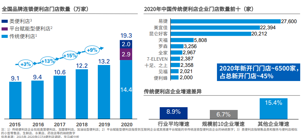 2020年即便是在疫情的影响下,以及受线上冲击实体零售增速普遍较低的情况中,国内便利店行业依然保持着高速增长,全国品牌连锁便利店门店总数突破19万家,销售额2961亿元。