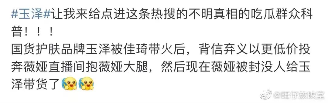 女王发现,和薇娅有关联的国货护肤品牌——玉泽又被推上了风口浪尖,并在某时段占据了微博文娱热搜榜第一的焦点位置。有网友表示,玉泽在被李佳琦带火之后,“背信弃义”以更低价投奔薇娅,现在薇娅被封没人给它带货了。