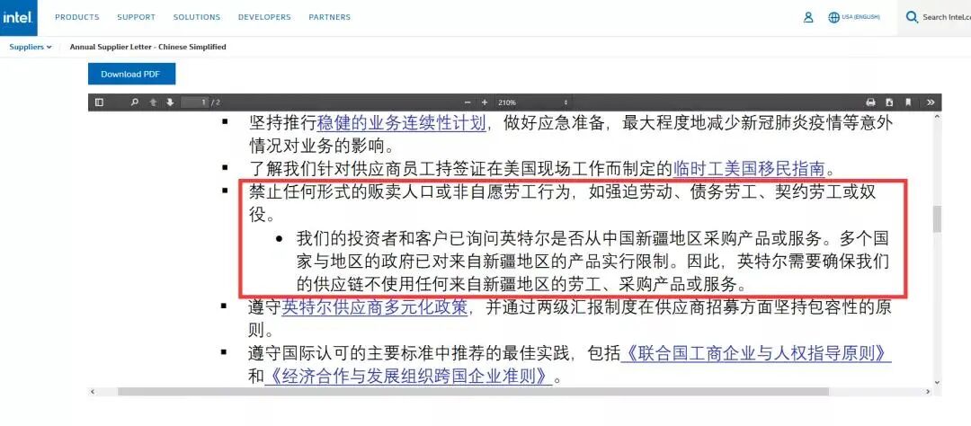 “我们的投资者和客户已询问英特尔是否从中国新疆地区采购产品或服务。多个国家与地区的政府已对来自新疆地区的产品实行限制。因此,英特尔需要确保我们的供应链不使用任何来自新疆地区的劳工、采购产品或服务。”