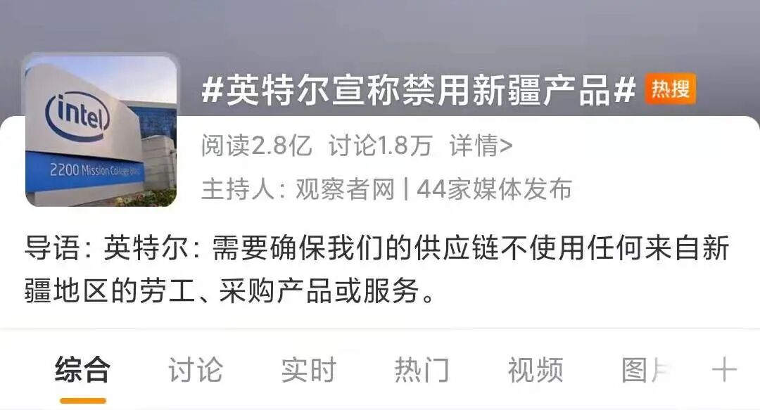 这不,昨天一条#英特尔宣称禁用新疆产品#的新闻挂上了热搜。
