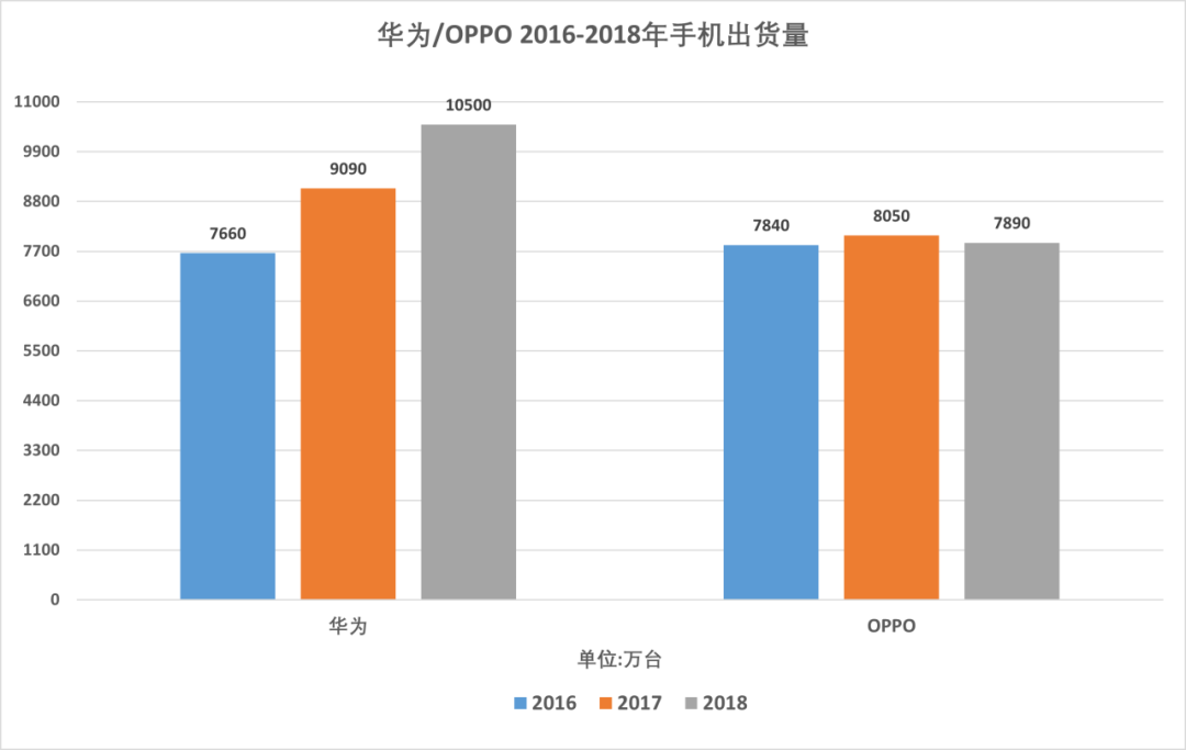 华为与OPPO在2016-18年间出货量 奇偶派制图