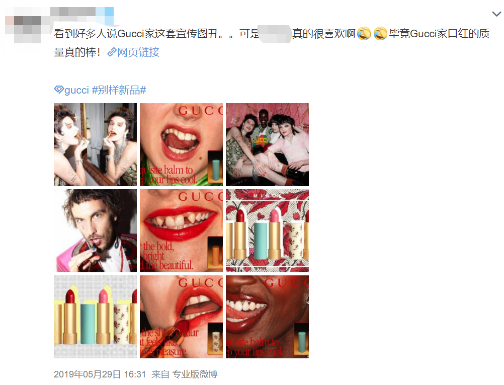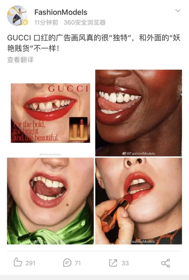 以及有人认为从产品表现上代表着,即使牙不好看,涂上口红也能散发自信。另一方面,有人就觉得太丑了,甚至能引起了生理上的不适,或者看着更像牙膏广告。如果说是单卖产品本身功能上的优势和先进特色,或者产品本身更高级的质感以及美感,圈佬觉得,这么做确实偏离轨道,不太合适。但换一个思路来看,作为一个奢侈品品牌,相比较以大众化的审美来取悦受众,可能更偏好于做一个精神上的突破者和引领者,特立独行和标新立异的一方。值得注意的是,那位留有牙缝的的 GUCCI 口红代言人 Dani Miller 同时也是独立摇滚乐团 Surfbort 的主唱。