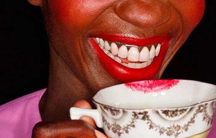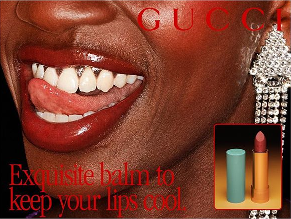 不仅如此,Gucci还推出了一些不带产品,只有沾杯的平面,用黑人模特和高龄模特这种不走主流美妆产品风格的角色,可以感受到品牌拥抱多元种族、年龄的理念;尤其是高龄模特的形象,打破了传统一贯的审美,拓展了更多可能性,传达出一种无畏年龄追求美丽的自信。同时这种自信还呈现于留在茶杯上的唇印上——不管别人的眼光,自我享受就好。不仅没有把在杯子上的唇膏当做一种需要被隐藏和擦去的印记,而是把它当做一种充满魅力和美的符号,大胆地表现出来。