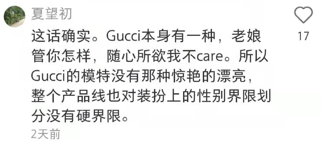 Gucci这些肆意而张扬的宣传内容,应该是在表达一种发自内心,不顾眼光的大胆与自信。追求的不是一种传统意义上令人愉悦的美感,而是一种扎眼的自我表达,这么考虑还蛮炸场的。可能对大部分人来说,从审美表现上来看确实很难接受,