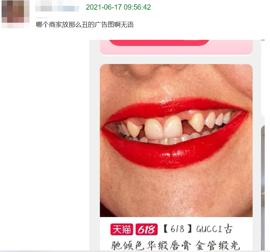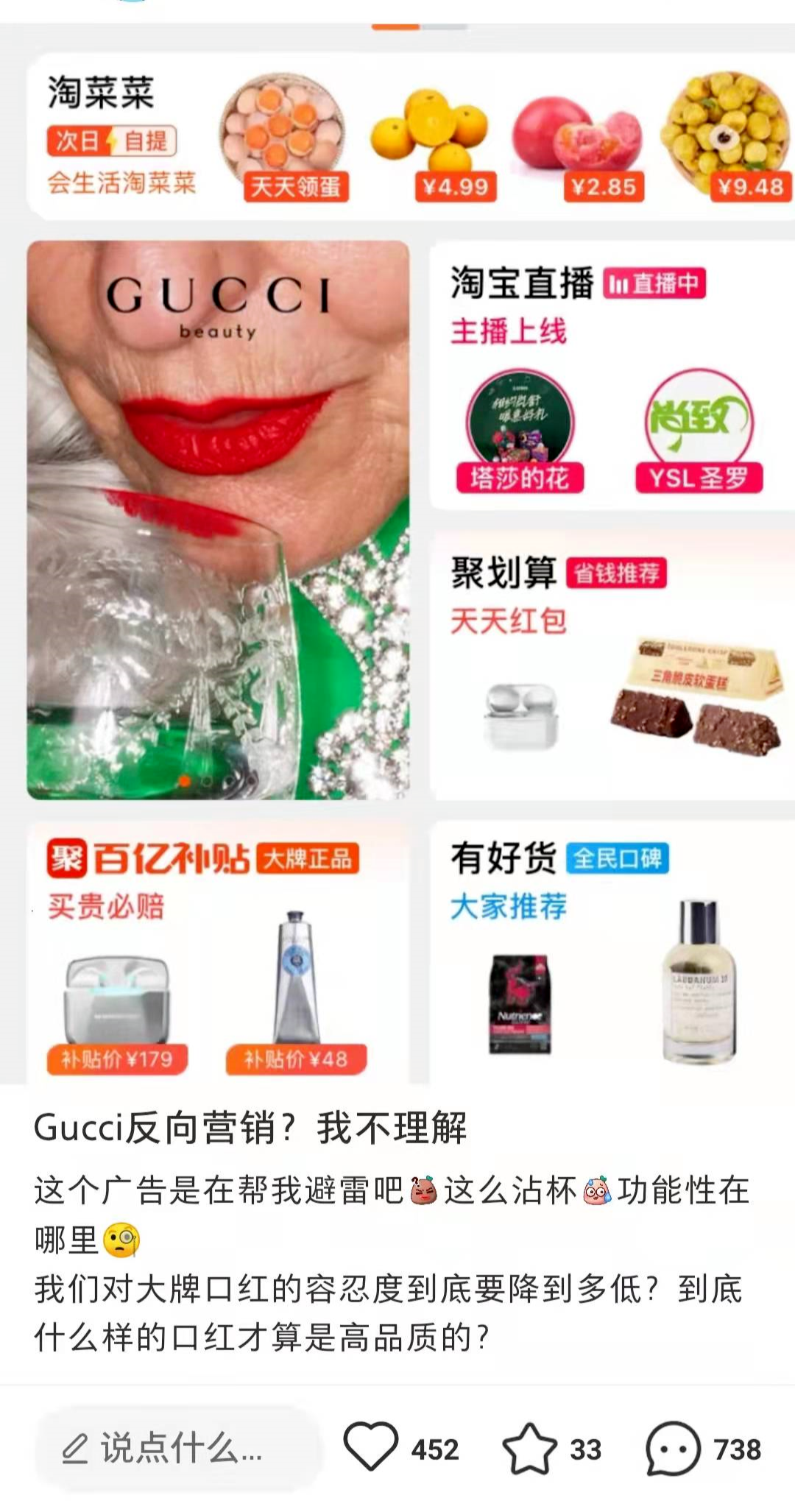 有博主在小红书上po出了一张淘宝页面截图,其中的Gucci口红平面相当扎眼。