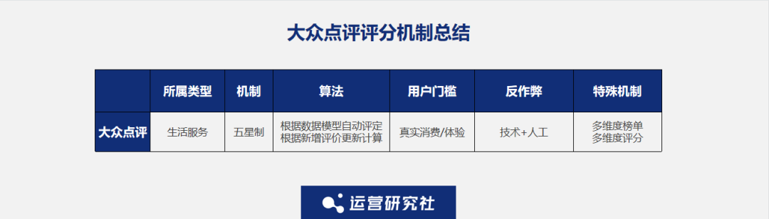 与其他平台的五星制不同,大众点评上,用户除了需要对商家做一个总体星级评分,还可以从细分维度进行打分。以餐饮领域为例,大众点评设计的是“口味”、“环境”和“服务”三个维度,以更好地还原线下餐饮服务的全貌。在评分规则上,大众点评商户星级评分不是简单的算术平均,而是综合近期众多用户的“总体评价”,在没有人工干预的情况下,完全根据数据模型自动评定而出。特别的是,星级反馈的不是绝对的评分,而是商户在同类目下的相对水平。在反作弊机制上,大众点评也建立了相应的应对机制 ,采用了「算法 + 人工」的双重审核机制。大众点评会根据不同的评价场景,定期迭代和优化算法,并结合人工审核监督,确保平台上展示的评价能够反映用户真实体验后的感受。例如,借助风控系统,识别和过滤评价内容。只有通过「过滤机制」的评价,才会在精选评价页面展示。这一切,都是为了可以帮助用户筛选、对比商户,从多维度匹配到符合消费者要求的商户。通过拆解五个平台的评分系统,运营社发现,每个平台的机制、算法、门槛等都有很大的差异: