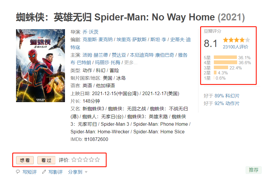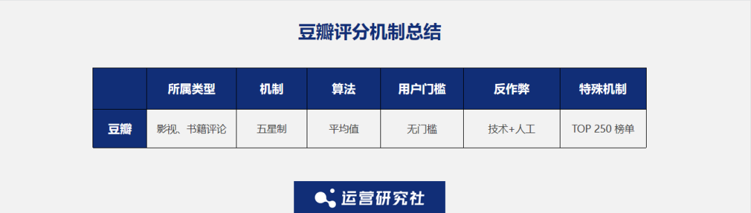 为了深扒一下各平台的评分系统,运营社选择了来自国内外、不同领域的产品所携带的评分机制进行分析。它们分别是:影视评价领域的豆瓣和烂番茄、游戏领域的 STEAM、电子商务平台亚马逊和所属生活服务领域的大众点评。豆瓣电影做评分系统的主旨和原则是,“尽力还原大众对一部电影的「平均看法」”。为了实现这个目标,豆瓣的评分系统主要有以下三个特点:五星制是目前市场上大部分评分系统都使用的机制,它保证了用户在评分时,不会因为选项太多而无从下手,也不会因为选项太少而无法准确表达。豆瓣的创始人兼 CEO @阿北 曾对此做过详细的解释:如果一部电影有 42 万用户打分,豆瓣的打分程序会自动将这 42 万个“一到五星”兑换成“零到十分”,将其加起来除以 42 万,就得到了豆瓣评分。值得注意的是,在这个评分过程中没有人工审核,也没有编辑干预。每过若干分钟,程序会自动重跑一遍,把最新打分的人的意见包括进来。