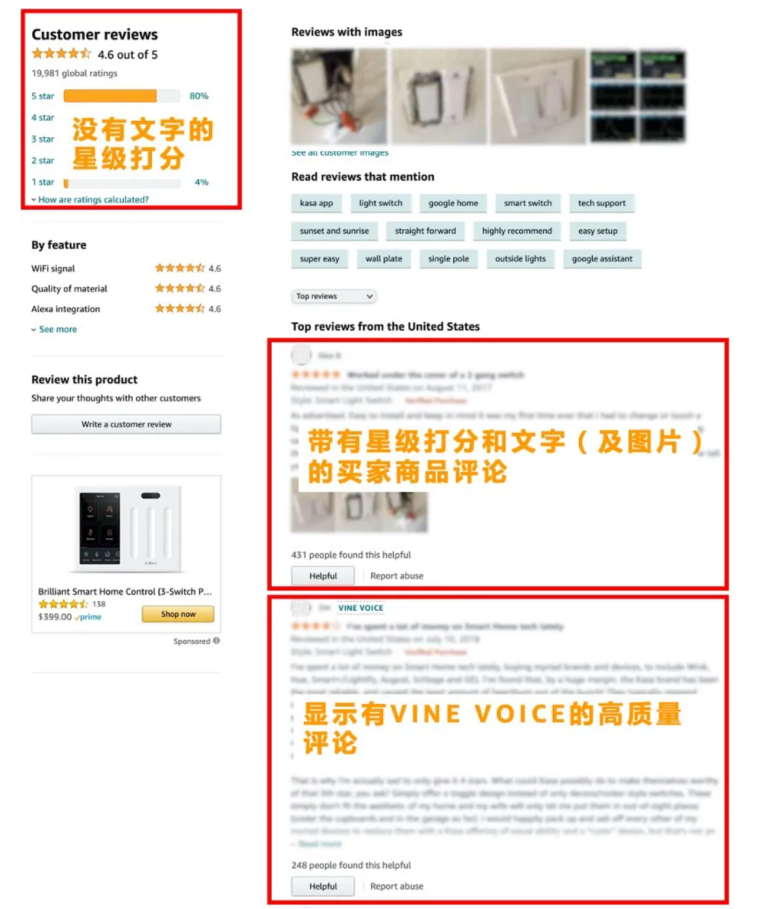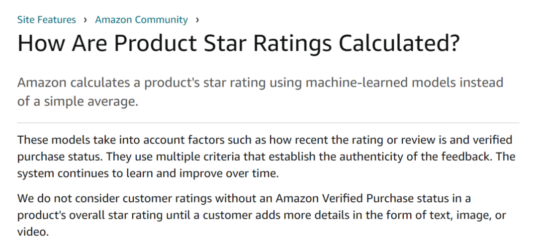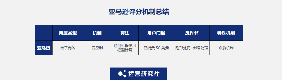 比方说,推荐比率在 90% 以上,且评论数达到一定数量就可以被算为「好评如潮」,以此类推。但实际上,在好评如潮的标签下,很多游戏的质量并不统一,有一定程度上的质量参差。这些质量参差在其他平台上,打分差异可能会很明显,但在 STEAM 上,便被“一视同仁”了起来。所以,STEAM 评分一般有失公允,很难作为游戏好坏的客观评价,只能代表玩家对一款游戏的喜好。而 STEAM 不修改此机制,主要原因在于它是卖游戏的平台,而不是评测媒体。STEAM 只需要把游戏的最终评价告诉玩家,玩家能从推荐与不推荐的评价中了解到该游戏的优劣,从而决策自己的消费即可。用户不需要感知游戏质量的精细区别,都是“好评如潮”或“特别好评”,反而能降低用户的决策门槛,从而促进用户消费。亚马逊这类电商平台,设计评分系统的目的和 STEAM 这类游戏公司有些类似,都是在购物平台上显示评分,帮助用户做购物决策,从而促进消费。所以,一套评分系统是否能准确反映顾客对于商品的真实体验尤为重要。亚马逊的评价管理体系中,有 Feedback 和 Review 两类评分,两者相互独立但又互相影响。Feedback,是客户针对购买的订单做出的评价,也就是评价主体必须客户购买的产品,主要针对产品品质、服务水平、发货时效和货品描述等维度,影响的是卖家账号层面以及店铺ODR指标的变化,可以类比淘宝店铺评分体系。Review,主要是针对商品的评价和打分,可以翻译成“留评”,亚马逊平台用户都可以对商品做出评价。本文讨论的主要是 Review,即亚马逊商品页的评价评分体系,主要集中在这三个方面。在用户打分环节,亚马逊也采用了 5 分制打分法,所以不少用户以为商品最后的星级评分只是简单地算了一下平均数。其实不然,根据亚马逊官方给出的资料,亚马逊会给不同用户的星级评分赋予权重。哪些用户的评分权重更高,哪些用户的评分权重更低呢?亚马逊设计了三个维度来评判:首先,购买过该商品的用户,会比没有购买过该商品的用户权重高;通过上述三个维度,亚马逊给不同用户的评分赋予了不一样的权重,最终得出了加权平均数。亚马逊想通过打造多重评论的形式,建立高质量的评论区,帮助用户做消费决策。在亚马逊的商品详情页,用户会看到三种不同的商品评论形式:第一种,没有文字的星级打分,也就是常见的评分分布柱状图,方便用户了解商品评分情况。第二种,是带有星级打分和文字(及图片)的买家商品评论,也就是“买家秀”。第三种,则是最为特殊的 Vine 评论,类似“新品 0 元试用评论”,只有参加了亚马逊的“Vine计划”的用户,其评论后面才会出现「Vine」的标志。而每个商品最多只能有 30 个 Vine 评论。第三,为了防止卖家刷分、造假,亚马逊在设计完上述评分机制后,还有一套严格的“防作弊系统”。例如,评论有门槛,如果用户想进行评论,必须在过去 12 个月内用有效的信用卡或借记卡在亚马逊上消费至少 50 美元。亚马逊官方也曾多次表态对评论违规行为实行“零容忍”政策,如果发现发现卖家有任何试图操控买家评论的行为,亚马逊会立即采取措施:立即永久撤销卖家在亚马逊上的销售权限,包括扣留资金;移除商品的所有评论,并且阻止商品日后收到评论或评级;对卖家采取法律行动,包括诉讼和移交民事和刑事执法机构;