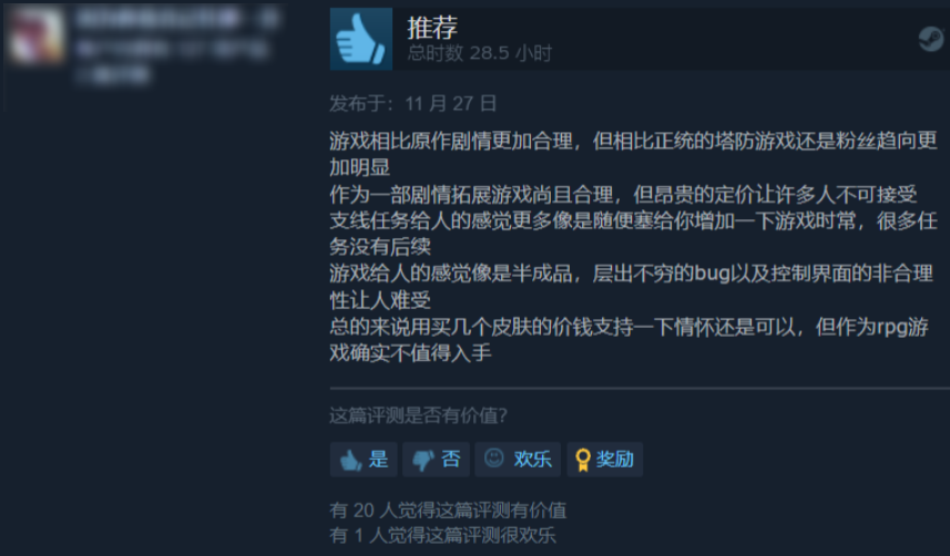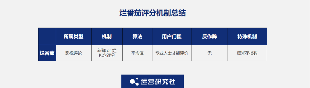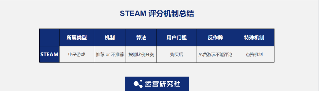 为了保证影片评价的专业性,烂番茄的打分权只控制在 3000 个左右专业影评人(被官方认证的影评人或机构)手中。普通用户,则只能通过打分影响一部影片的“爆米花值” Audience Score(下图爆米花旁边的分数)。虽然这套体系在尽量照顾评论人数和专业影评质量的协调性,但是过于极端的评价机制也引起了不小的争论。很多专业影评人表示,单调的“新鲜”和“不新鲜”只能代表第一观感,但是很难体现他们对影片更为细腻的评审。于是,烂番茄推出了 0-10 分制的打分机制(平均分)。这样一来,用户在查阅“番茄新鲜指数”的同时,也能参考平均分得到更为细腻的质量分析。不少用户表示,“新鲜指数”决定了自己是否会观看该部电影,但是“最终得分”决定了自己先看哪一部电影。比如《极盗车神》和《敦刻尔克》的烂番茄新鲜指数差不多,但是《极盗车神》打分只有 8 分,落后于《敦刻尔克》的 8.7 分。STEAM 是一家游戏平台公司,其评分系统采取的是「两级制度」,即用户评分,只有「推荐」和「不推荐」两个选项。这种评分体系虽然简单,但得出的结论并非绝对中肯,缺乏中立的评价。一款游戏,不可能十全十美。所以在这种评价机制下,运营社发现,“推荐评论”中,会有不少“认为游戏很多缺点,但值得一试”的评论。而在“不推荐评论”中,也会有很多“游戏是好游戏,但是别玩”的主观评论。同时,STEAM 会根据该游戏下用户的推荐比例,得出一个「综合评价」,共分为六种:好评如潮、特别好评、多半好评、褒贬不一、多半差评、差评如潮。