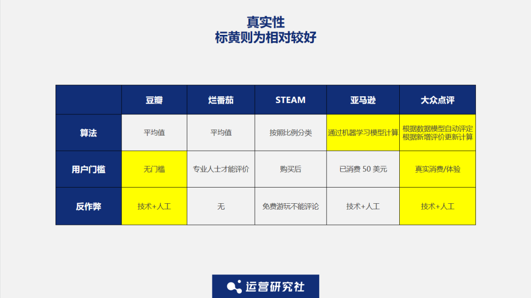 比如说,大众点评的星级也并不是简单的用户评价得分,而是反馈的商户在同类目下的相对水平。再比如说,目前,大众点评的星级每天会根据商户 4 天前新增的评价更新计算,这个时间段预留的是平台对评价的审核。同样的,亚马逊在评论质量内容考核、评论权重上也下了功夫。所以总的来说,相比于算法单薄的豆瓣和烂番茄,大众点评和亚马逊的算法,可以保障评价体系呈现更加真实的情况。一般来说,门槛的提高,反而过滤了普通用户的发声机会。这一点可以类比一些选秀综艺,当只有所谓的“专家评委”时,最终评选的结果对于普通用户来说,是很难有信服力的。就像烂番茄,普通用户只能通过“爆米花”来发表自己的看法,但影响排名的重要因素“烂番茄新鲜指数”,被掌握在专业人士手中,而专业人士的口味在某种意义上讲是“有偏差”的。所以,烂番茄相对比其他平台,评分机制更具备专业性,但真实性反而有所降低。首先需明确的是,任何一个机制的发展都无法彻底消除作弊因素,这是一个共生共存长期对抗的过程。评分系统的反作弊机制越强、力度越大,供需两侧违规行为的处置越强,那评分系统的真实性越高。目前平台主要通过两个维度来实现“反作弊”:一方面是从机制和算法上实现反作弊;另一方面是通过加大对违规用户和商户的处置,来净化平台氛围。在机制和算法层面,烂番茄、STEAM、亚马逊都是通过“设置门槛”来实现反作弊,豆瓣则是通过“剔除不正常打分”实现反作弊,而大众点评通过风控系统+人工审核,提前识别和过滤评价内容,只有通过过滤机制的评价,才会在精选评价页面展示。在违规行为处理层面,豆瓣和烂番茄比较难对“影片”进行处罚,而亚马逊和大众点评,则可以直接对好评的受益方——商户进行处罚,不仅有平台内部的处罚,还有联动监管部门的打击。根据运营社了解,亚马逊对违规商家的打击力度非常大。今年 9 月,亚马逊方面表示,在过去的 5 个月,亚马逊关闭了约 600 个中国品牌的销售权限,其中涉及这些品牌的约 3000 个卖家账号。据了解,卖家被封主要原因是刷单,违反了亚马逊政策。目前国内各个部门到互联网企业,对于刷单炒信的态度也是非常坚决。上周,中央网信办发文表示,将在全国范围内开展为期2个月的“清朗·打击流量造假、黑公关、网络水军”专项行动。此前,大众点评就在加大了对于刷单炒信的治理:对违规刷评价的商户进行“星级隐藏”、“排序降权”、“商户页公示”等,违规用户也会涉及“等级降级”、“撤销 VIP ”、“禁发评价、笔记、图片、视频等内容”等多项处理措施。