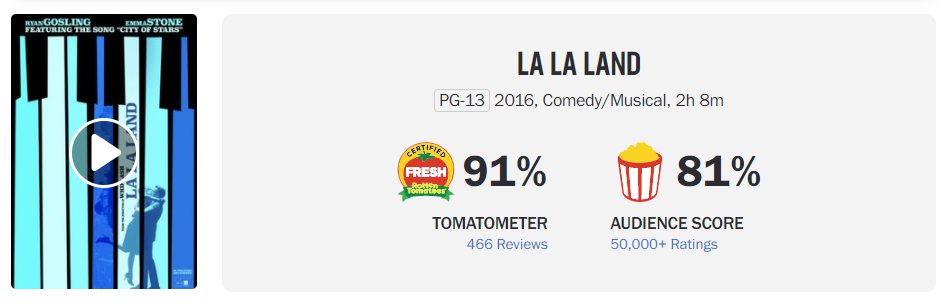 通过以上三点,豆瓣电影在算法优化中坚持评分中立原则,保障了整套系统独立、健康运转,也使得豆瓣目前仍然是中国互联网书影音领域中具有公信力和参考价值的平台,以客观性影响着用户的观影选择。烂番茄(ROTTEN TOMATOES)是美国一个影视评分网站,其在美国的影响力,相当于国内的豆瓣。首先,烂番茄衡量作品优劣,不是像豆瓣那样打分,而是通过“番茄的新鲜指数”表现。用户的评价选项只有两个,要么是鲜红的番茄(fresh),要么是腐烂的绿番茄(rotten)。平台会根据用户的好评率,决定“番茄的新鲜指数”,也就是作品是否优秀。“烂(Rotten)” ,意味着这部影片好评率低于 60% ;“新鲜(Fresh) ”,意味着这部影片有 60-100% 的好评;“绝对新鲜(Certified fresh)”,意味着这部影片有 80 条以上的评分,且其中的 70% 及以上是好评,且 5 个或以上评论来自顶级影评人。