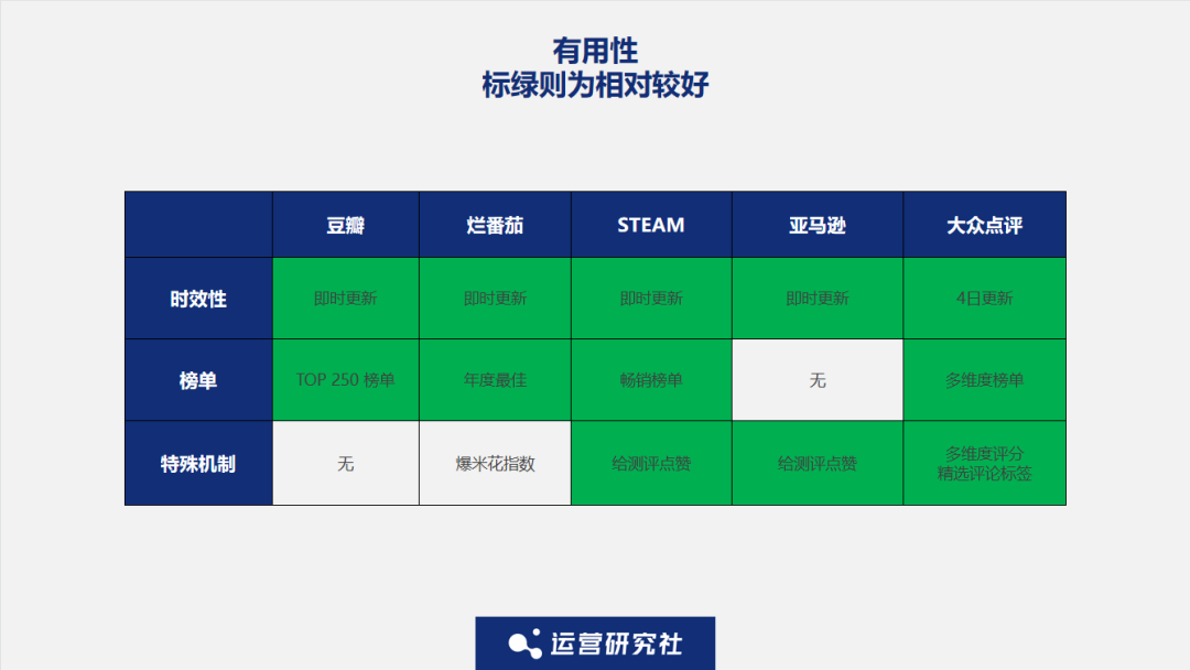 据公开数据显示,2021 年 1-5 月,大众点评处罚“刷好评”用户账号 5 万个,处罚“刷单”“刷评”商户 1 万余家,协同执法机关打击 29 个非法刷单网络灰黑产团伙。对此,在真实性的维度下,5 大平台的评分系统评价如下:在本文开头提到:评分系统存在的价值是将“隐性”的东西“显性化”,也就是将用户评价数据化,并可视化,给到其他用户做参考。所以,评分系统对于用户是否有用、能否帮助用户解决问题,是评判系统是否优秀的重要因素。在产品或服务本身会变化的情况下,评分的时效性越强,对用户越有实质性的帮助。比如,当用户想寻找饭店,但搜索出来的是商家 2 - 3 年前的评分和评论,很可能并不能反映商家现在的水平,这就会给用户带来困扰。相比之下,影片、游戏、商品相对来说是比较稳定的,这些产品仅需在上线初期,能够比较快地更新评分,给用户足够的信息即可。而像本地生活这样场景,商家服务和产品的稳定性相对难保证,大众点评及时更新评价就显得尤为重要。大众点评的评分,每天会根据商户 4 天前新增的评价更新计算,就更好地保证了评价的时效性。榜单也是评分系统很重要的产品之一,可以快速帮助用户找到所需要的产品或服务。例如,豆瓣的 TOP 250 榜单,可以帮助“电影荒”的用户解决找不到电影看的难题。在榜单层面,可以说是维度越细,越能满足用户“发现”的需求。大众点评的「榜单」在这一点上就做得很有用户思维,不仅吃住玩多个榜单,光“吃”就有菜系划分、区域划分及不同类型榜单的划分。比如日常想外出吃点特色的,可以看「必吃榜」;对品质有要求,可以看「黑珍珠」榜单;单纯对口味有追求,可以看「口味榜」等等,全方位满足用户需求。为了更进一步提升评价的有用性,部分平台还会推出一些特殊机制。比如,亚马逊的“是否有帮助机制”,让用户对评论进行投票表决“是否有帮助”。如下图,顾客在阅读完该评论后,就可以投票表决此评论是否有帮助。最终评论会显示“觉得有帮助”的人数,从而增加该评论的可信度。与之相似的是,STEAM 也有相关功能,通过其他用户判断评论是否有价值:比如说,大众点评除了总体评分,还有“口味”、“环境”和“服务”三个维度的评分,用户可以结合自己的偏好,做出最优选。再比如说,在精选评价下,平台会根据用户评价提炼不同的标签词。如此一来,用户可以选择自己最关心的标签进一步查看评论,快速了解关键信息。了解完这些评分系统后,不难发现,做一个既真实又有用的评分系统,是相当困难的事情。