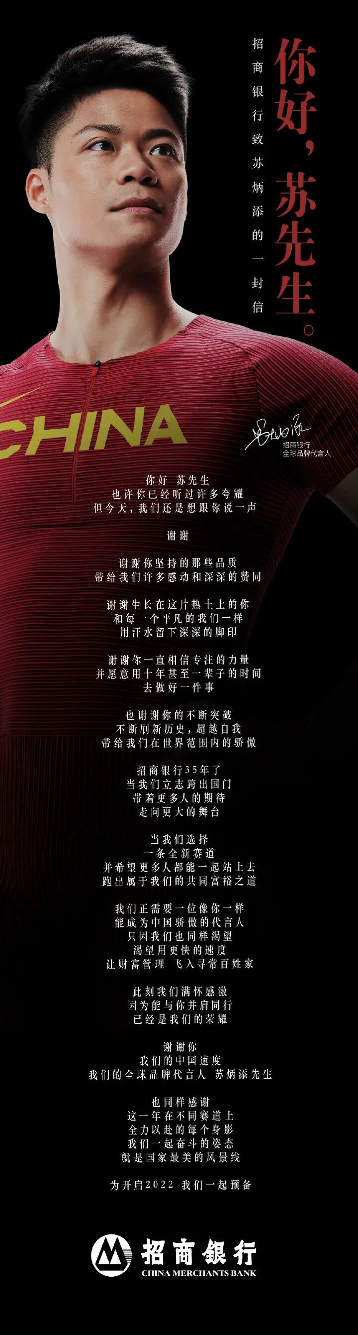 文案来自招商银行写给苏炳添的信。招商银行官宣苏炳添为首位全球品牌代言人,并给其写了一封信,以感谢的名义讲述了代言人对招商银行的重要意义,但同时,这封信也是写给每一个招行用户,结尾文案最早出自新华网评:你的奋斗姿态就是国家最美风景线 ,表达每个个体的重要性。这样的感谢信让人倍感温暖。